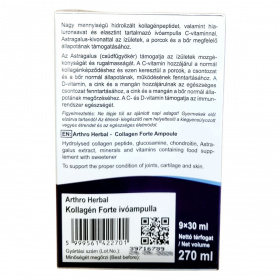 Az Arthro Herbal Kollagén Forte ivóampulla egy folyékony étrend-kiegészítő, amelyet az ízületek, a porcok, a csontok és a bőr megfelelő állapotának támogatására fejlesztettek ki. A termék nagy mennyiségű hidrolizált kollagénpeptidet, valamint hialuronsavat és elasztint tartalmaz. Az Astragalus-kivonat hozzájárulhat az ízületek mozgékonyságához és rugalmasságához, míg a C-vitamin támogathatja a normál kollagénképződést. A D-vitamin, a cink és a mangán hozzájárulhatnak az egészséges csontozat fenntartásához. A termék édesítőszerrel készül, és megbízható minőséget képvisel, amelyet a helyes gyártási gyakorlat biztosít.