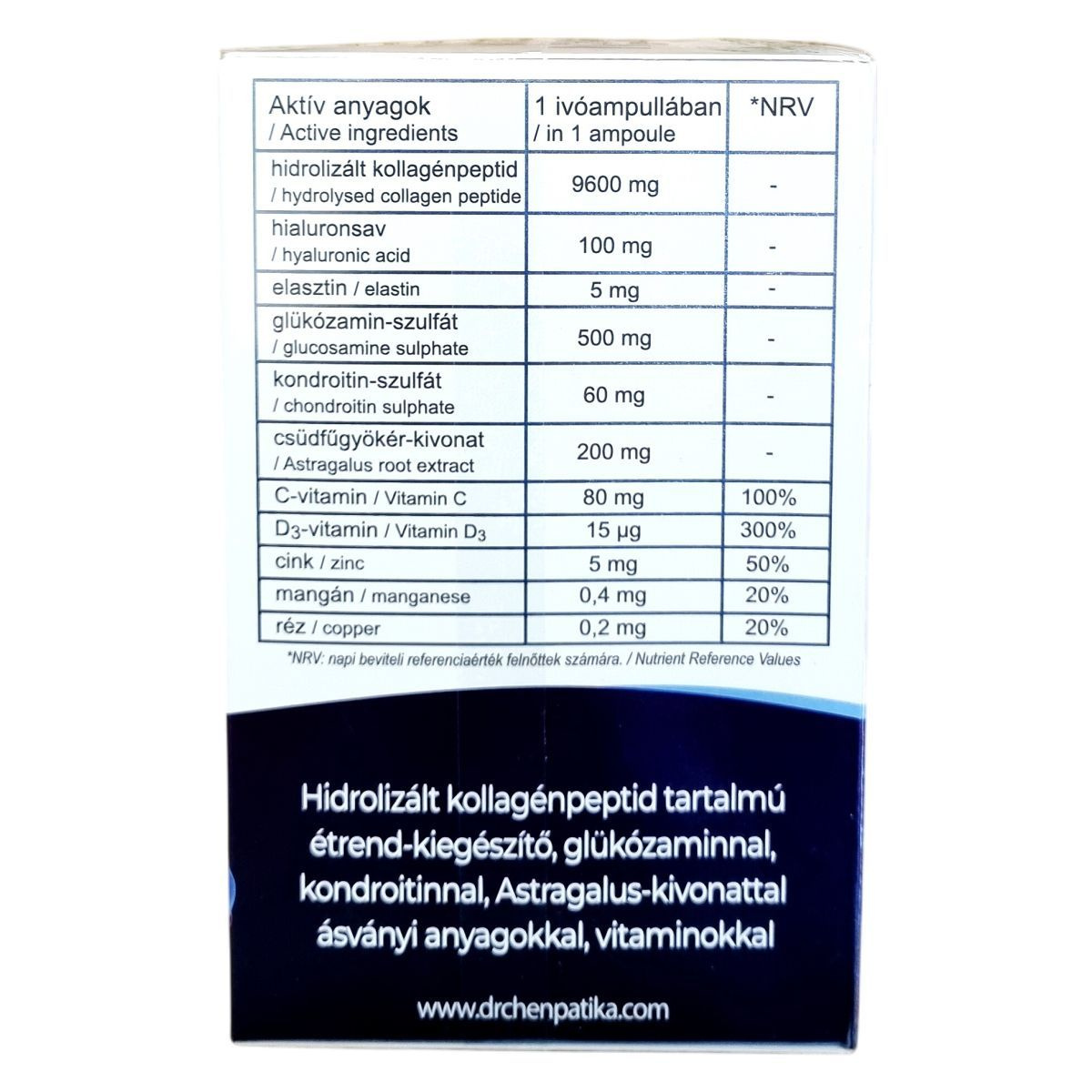 A termék hidrolizált kollagénpeptidet, glükózamint, kondroitint és Astragalus-kivonatot tartalmazhat, amelyek hozzájárulhatnak az ízületek, a porcok és a bőr megfelelő állapotának fenntartásához.