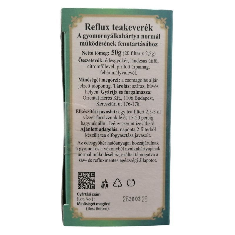 A tea tartalmaz olyan gyógynövényeket, mint az édeskömény és a kamilla, amelyek gyulladáscsökkentő hatásukról ismertek. Az édeskömény segíti az emésztést és csökkenti a puffadást, míg a kamilla nyugtató hatású, amely segít megnyugtatni a gyomor irritációját. Ezek a hatóanyagok együtt hozzájárulnak a gyomor egészségének fenntartásához és a reflux tüneteinek csökkentéséhez.