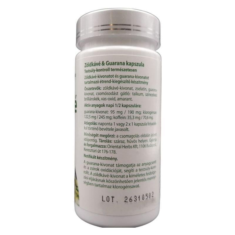 A guarana-kivonat támogathatja az anyagcserét és a zsírok oxidációját, segítheti a testsúly-kontrollt. A zöldkávé-kivonat a kíméletes feldolgozási eljárásnak köszönhetően jelentős mennyiségben tartalmaz klorogénsavat.