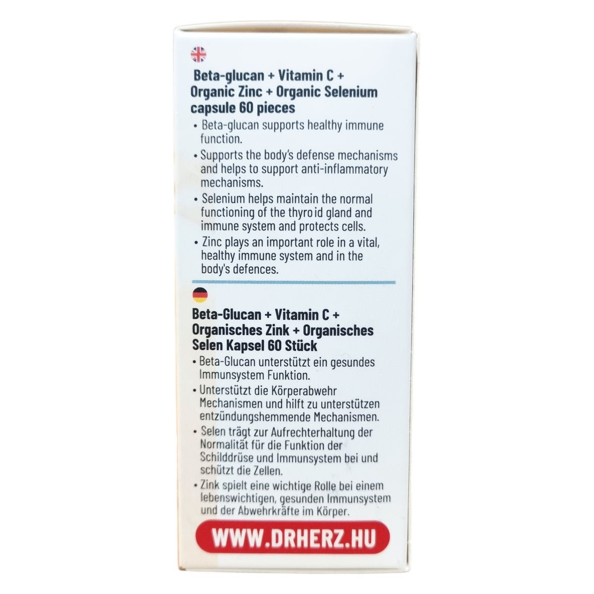 A Dr.Herz® Béta-Glükán + C-vitamin + Szerves cink + Szerves szelén kapszula egy olyan étrend-kiegészítő, amely 2 kapszula napi adagban béta-glükánt (1,3/1,6 D), C-vitamint, szerves szelént és szerves cinket tartalmaz. Ezek a hatóanyagok együttesen támogathatják az immunrendszer normál működését, hozzájárulhatnak a sejtek oxidatív stresszel szembeni védelméhez, valamint segíthetik a haj és köröm egészséges állapotának fenntartását. A béta-glükán támogatja a szervezet védekezőképességét és az anti-gyulladásos mechanizmusokat, a szelén és a cink a normál immunrendszeri funkciókat, míg a C-vitamin az antioxidáns védekezést erősítheti. A kapszula összetevői között szerepelnek természetes eredetű anyagok, mint az élesztőgomba kivonat és a szerves formában jelenlévő nyomelemek, valamint a kapszulahéj is növényi alapú, így a termék vegán életmódot követők számára is alkalmas lehet.