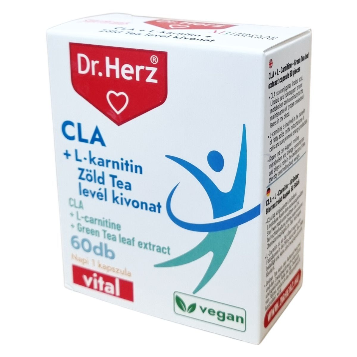 A Dr.Herz® CLA + L-karnitin + Zöld Tea levél kivonat kapszula egy 60 darabos kiszerelésű étrend-kiegészítő, mely konjugált linolsavat (CLA), L-karnitint és zöld tea levél kivonatot tartalmaz. A CLA linolsav, amely támogathatja az anyagcserét és hozzájárulhat a megfelelő koleszterinszint fenntartásához. Az L-karnitin szerepet játszik a zsírsavak sejtek mitokondriumaiba történő szállításában, ezáltal elősegítheti az energiatermelést. A zöld tea levél kivonat hozzájárulhat az alvás közbeni anyagcsere és energiapazarlás támogatásához, valamint a zsírok oxidációjához, ami segítheti a testsúly kontrollját. A készítmény kapszulahéja növényi eredetű, így vegán étrendbe is beilleszthető. A termék szedése javasolt főétkezés előtt, egy kapszulával, bőséges folyadékkal. Fontos betartani a javasolt napi adagot, továbbá gyermekek, várandós és szoptatós nők számára nem ajánlott. Az étrend-kiegészítő alkalmazása nem helyettesíti a kiegyensúlyozott és vegyes étrendet, valamint az egészséges életmódot.
