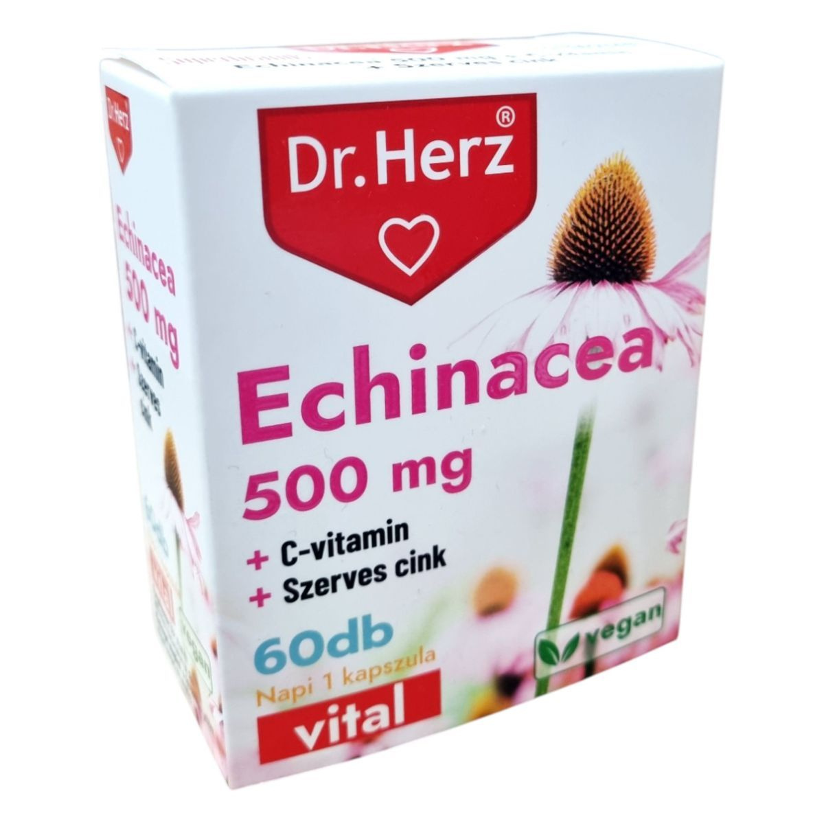A Dr. Herz Echinacea 500 mg + C-vitamin + Szerves cink kapszula egy étrend-kiegészítő, amely Echinacea kivonatot, C-vitamint és jól hasznosuló szerves cinket tartalmaz. Az összetevők hozzájárulhatnak az immunrendszer normál működéséhez, a fáradtság és a kifáradás csökkentéséhez, valamint a sejtek oxidatív stresszel szembeni védelméhez. A termék bio és vegán étrendi irányzatoknak is megfelel. Az OGYÉI által notifikált étrend-kiegészítő, melynek fogyasztása nem ajánlott terheseknek, szoptató anyáknak, 12 év alatti gyermekeknek és immunszupresszív terápiát alkalmazóknak.