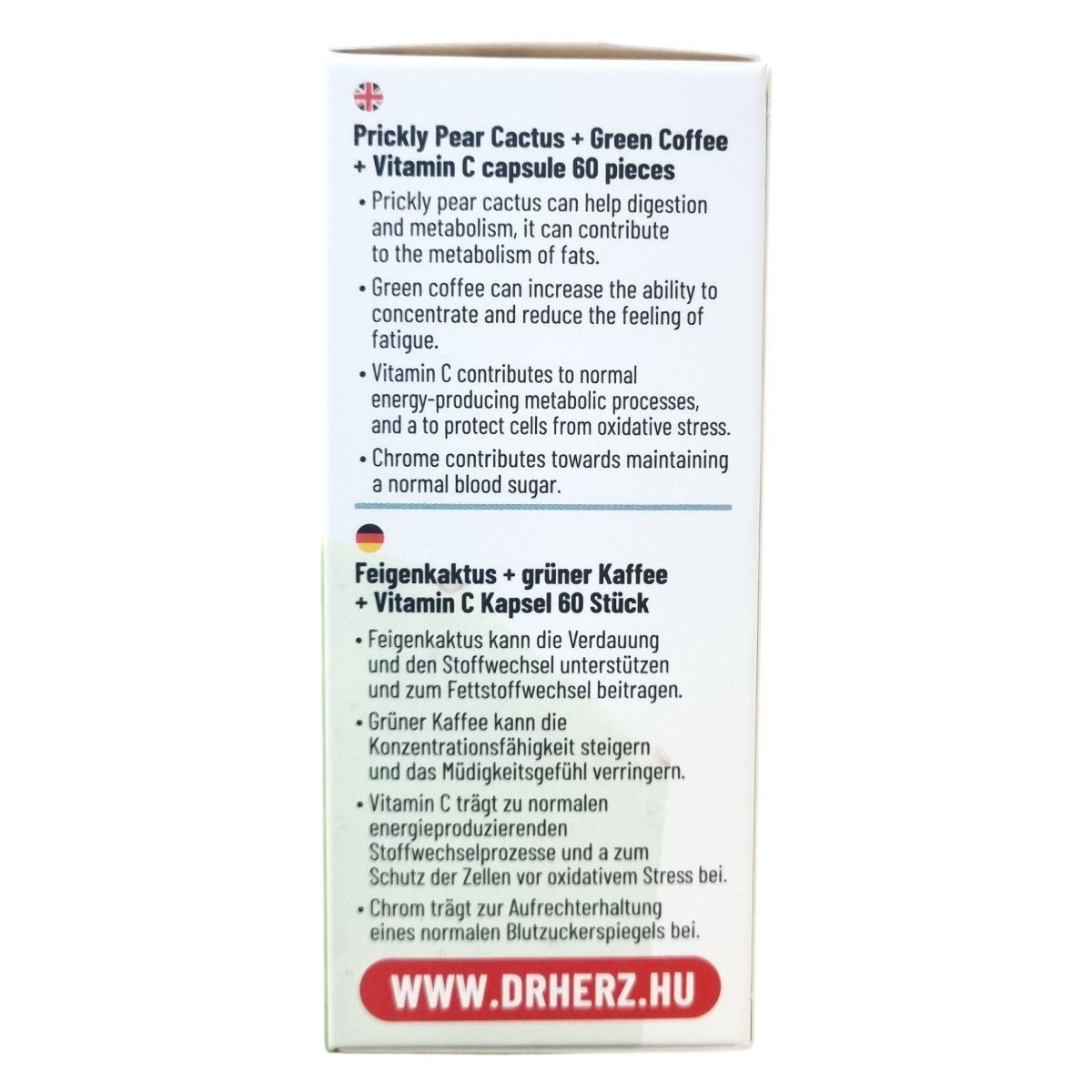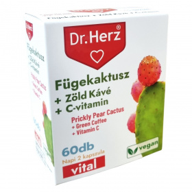 A Dr.Herz Fügekaktusz + Zöld Kávé + C-vitamin egy komplex étrend-kiegészítő, mely fügekaktuszlevél kivonatot, zöld kávé kivonatot, C-vitamint és szerves krómot tartalmaz. A fügekaktusz hozzájárulhat a emésztés és az anyagcsere támogatásához, valamint a zsírok anyagcseréjéhez. A zöld kávé elősegítheti a koncentráció képességét és csökkentheti a fáradtságérzetet. A C-vitamin hozzájárulhat a normál energiatermelő anyagcsere-folyamatokhoz és a sejtek oxidatív stresszel szembeni védelméhez. A króm segíthet a normál vércukorszint fenntartásában. A termék napi két kapszula adagban, főétkezések előtt ajánlott fogyasztásra, és a vegán étrendet követők számára is alkalmas. Fontos megjegyezni, hogy a termék koffeint is tartalmaz, ezért koffeinre érzékenyeknek nem ajánlott. Az ajánlott napi adagot nem szabad túllépni, és a termék nem helyettesíti a változatos étrendet és az egészséges életmódot.