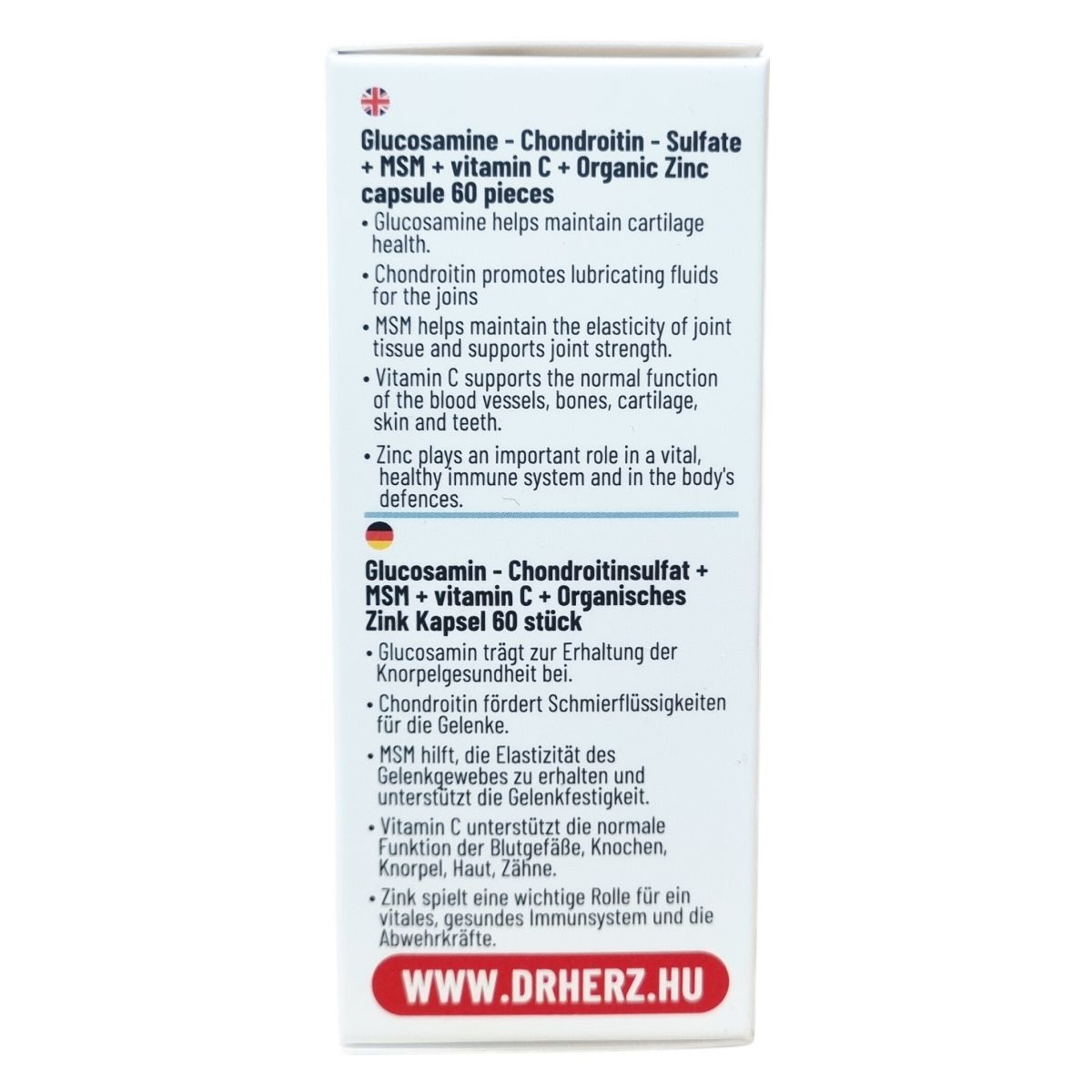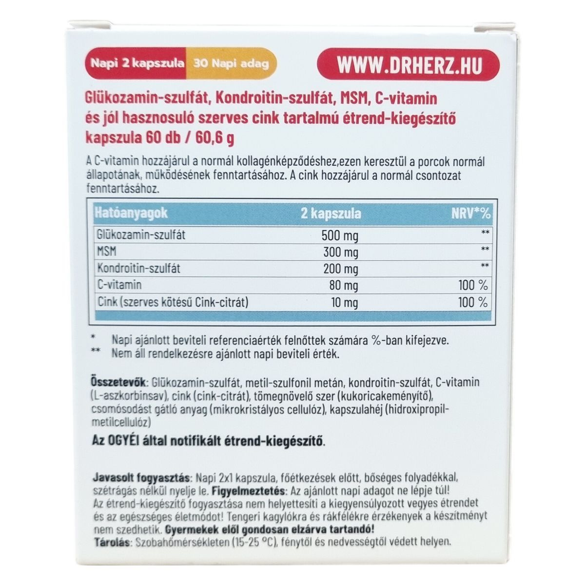 A készítmény glükozamin-szulfátot tartalmaz, amely hozzájárulhat a porcok egészségének fenntartásához. A kondroitin-szulfát segítheti az ízületek számára szükséges kenőfolyadék mennyiségét, míg az MSM támogatja az ízületi szövet rugalmasságát és az ízületek erősségét. A C-vitamin részt vehet az egészséges vérerek, csontok, porcok, bőr és fogak normál működésében, valamint a kollagénképződésben. A szerves kötésű cink fontos szerepet játszhat az immunrendszer működésében és a szervezet védekezőképességében. A tájékoztató felhívja a figyelmet arra, hogy a termék fogyasztása nem helyettesíti a kiegyensúlyozott étrendet és az egészséges életmódot, valamint hogy tengeri eredetű allergiások számára nem ajánlott. A kapszulákat javasolt napi két alkalommal, főétkezések előtt bőséges folyadékkal lenyelni.