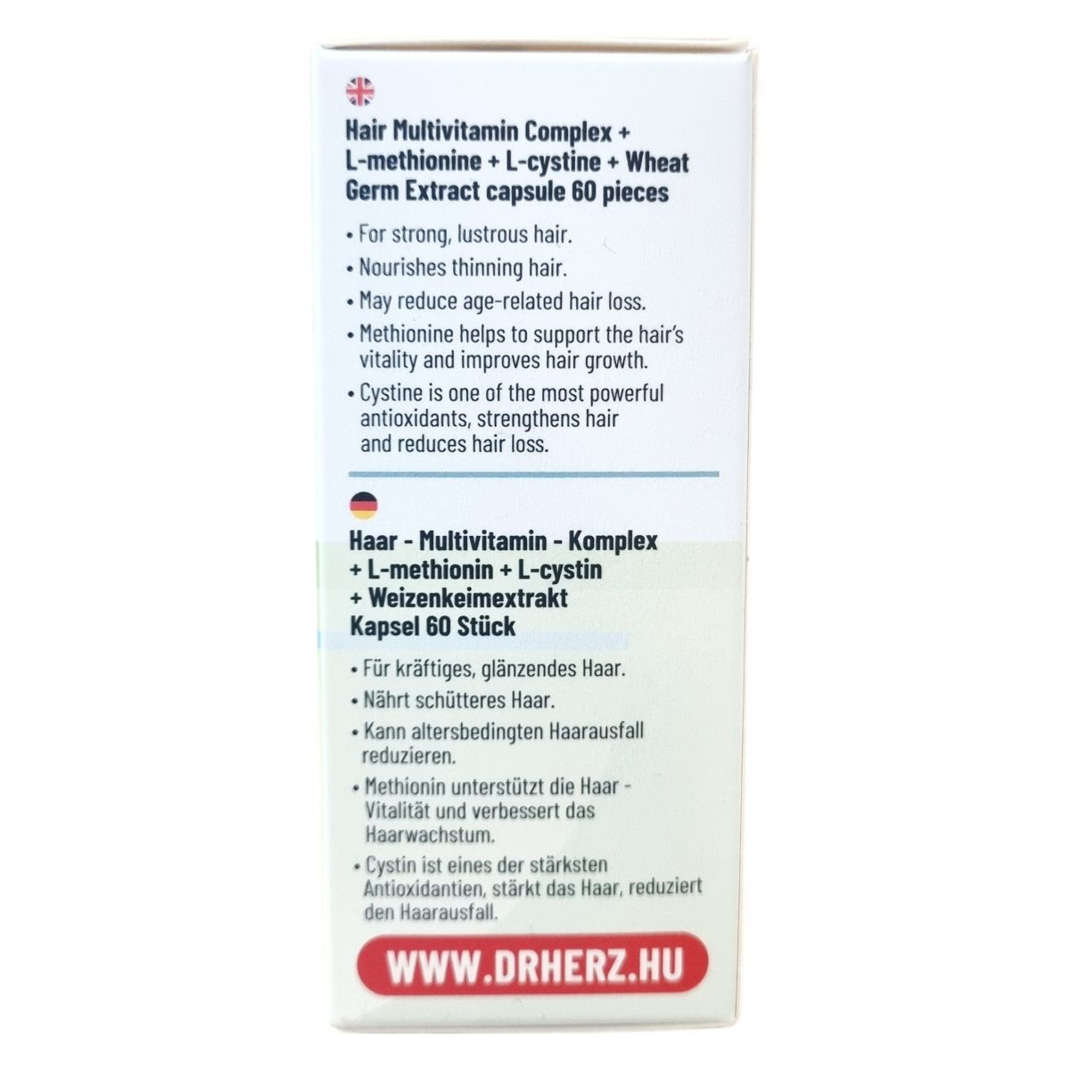 A Dr.Herz Haj Multivitamin Komplex speciális étrend-kiegészítő kapszula, amely búzacsíra kivonatot, köles port, L-cisztint, L-metionint és jól hasznosuló szerves cinket tartalmaz. A B5-vitamin részt vehet a normál energiatermelő folyamatokban, míg a B6-vitamin hozzájárulhat a normál cisztein-anyagcseréhez. A B7-vitamin a normál anyagcserében játszhat szerepet, és támogathatja a haj normál állapotának fenntartását. A cink védelmet nyújthat a sejtek oxidatív stresszel szemben, valamint hozzájárulhat a bőr, köröm és haj egészségéhez. A készítmény L-metionin és L-cisztin tartalma elősegítheti a haj vitalitását és erősítését, miközben antioxidáns hatású lehet. A kapszula napi egyszeri adagolásra ajánlott, vegán összetétele révén széles körben alkalmazható a haj ápolására és támogatására.