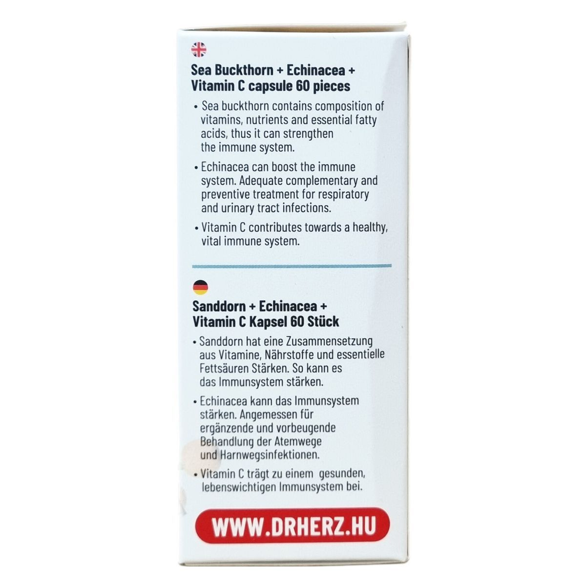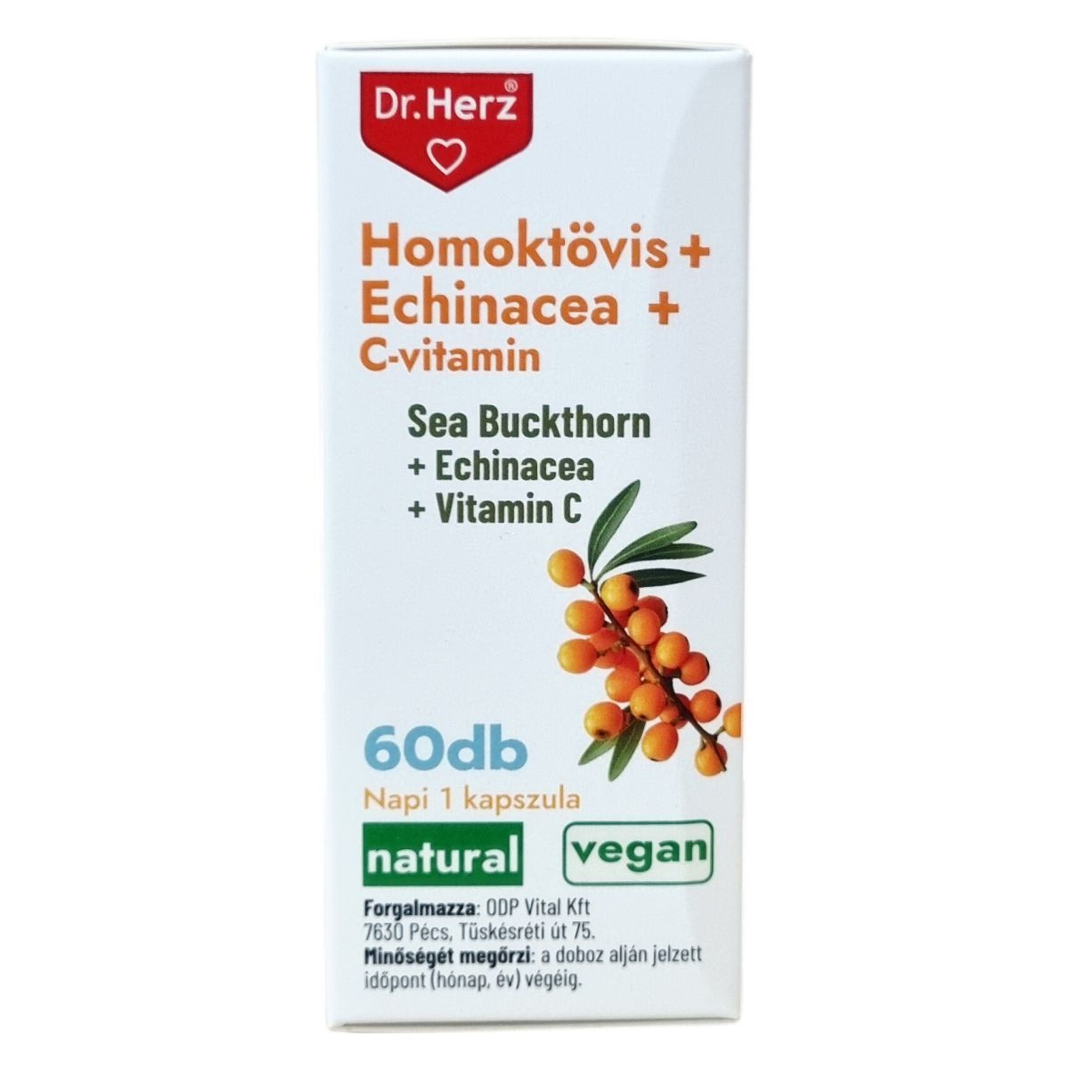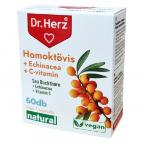 A Dr.Herz Homoktövis + Echinacea + C-vitamin kapszula 60 darabos kiszerelésben készül. A homoktövis termése összetett vitaminokat, tápanyagokat és esszenciális zsírsavakat tartalmaz, amelyek hozzájárulhatnak az immunrendszer erősítéséhez. Az echinacea növényi kivonat támogatja az immunrendszer működését, különösen ajánlott kiegészítő és megelőző kezelésként légúti és húgyúti fertőzések esetén. A C-vitamin szintén hozzájárul az immunrendszer egészségéhez, csökkentheti a fáradtságot és a kifáradást, segítheti a sejtek oxidatív stresszel szembeni védelmét, valamint támogathatja a pszichológiai és idegrendszer normál funkcióit. A kapszula vegán összetevőkből áll, szétrágás nélkül, bőséges folyadékkal ajánlott fogyasztani. A termék nem helyettesíti a változatos, kiegyensúlyozott étrendet és az egészséges életmódot.