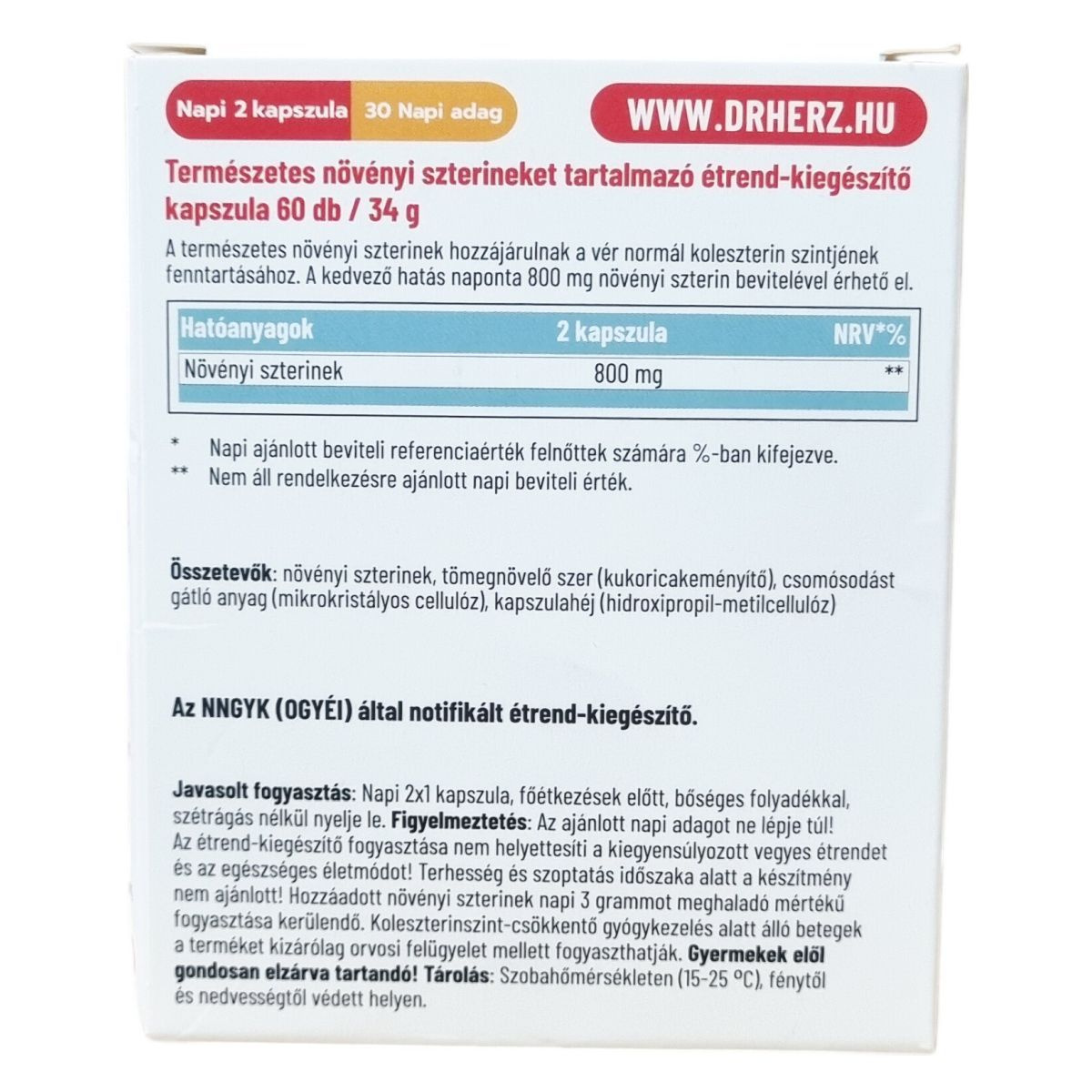 A Dr.Herz Koleszterin Optimum Plus természetes növényi szterinekkel tartalmazó kapszula 60 darabos kiszerelésben készül. A természetes növényi szterinek hozzájárulhatnak a vér normál koleszterinszintjének fenntartásához, amely fontos a szív és az érrendszer egészségének megőrzésében. A termék napi 2 kapszula fogyasztásával ajánlott, a kedvező hatás napi 800 mg növényi szterin bevitelével érhető el. A természetes összetevők között szerepelnek növényi szterinek, kukoricakeményítő mint tömegnövelő szer, mikrokristályos cellulóz csomósodást gátló anyagként, valamint vegán kapszulahéj, mely hidroxipropil-metilcellulózból áll. A készítmény nem tartalmaz állati eredetű összetevőket, ezért vegán étrendbe is beilleszthető. Fontos betartani az ajánlott adagolást, és a termék fogyasztása nem helyettesíti a kiegyensúlyozott étrendet és egészséges életmódot. Terhesség és szoptatás ideje alatt a használata nem javasolt, valamint 3 gramm feletti napi növényi szterinbevitel kerülendő. A koleszterinszint-csökkentő gyógyszeres kezelés alatt álló személyek csak orvosi felügyelettel használhatják a terméket. A készítményt gyermekektől elzárva kell tartani, és tárolása szobahőmérsékleten, fénytől és nedvességtől védett helyen ajánlott.