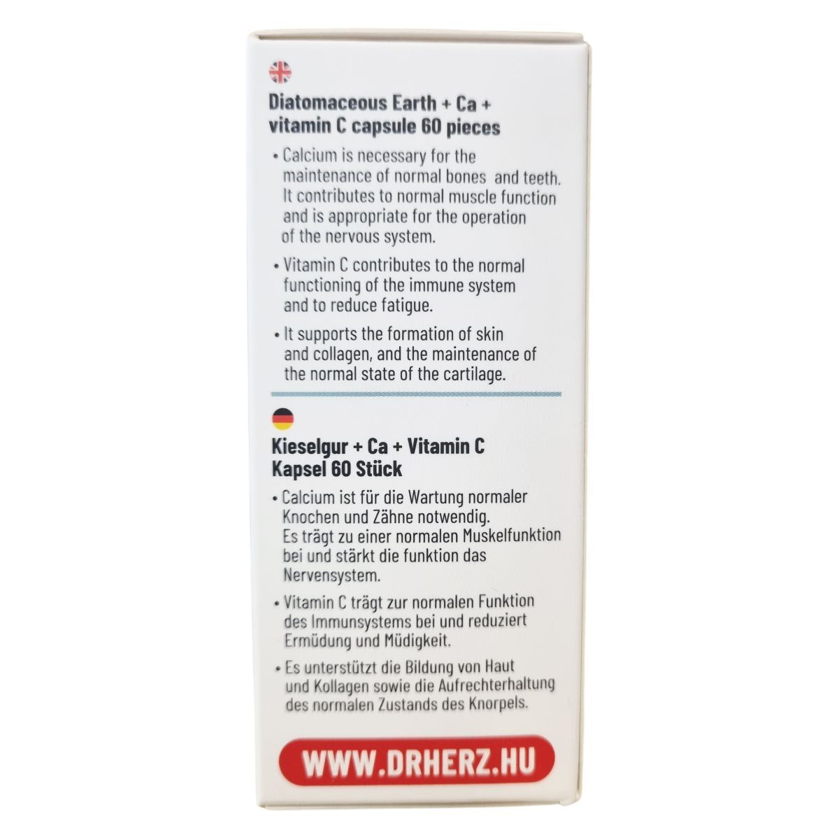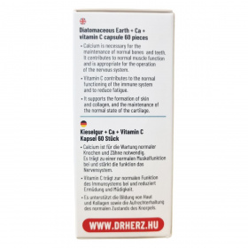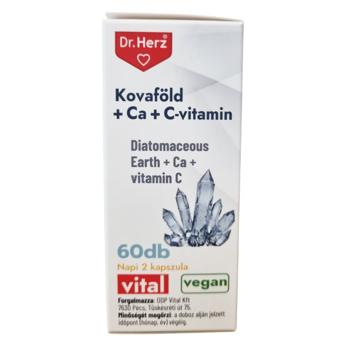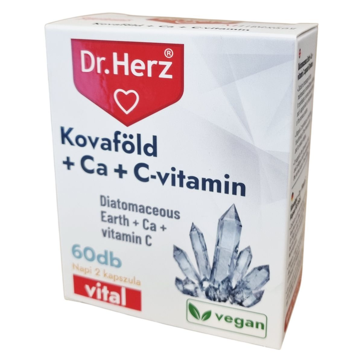 A Dr.Herz Kovaföld + Ca + C-vitamin kapszula szilícium-dioxidban gazdag kovaföldet, kalciumot és C-vitamint tartalmaz. A kalcium fontos az egészséges csontozat és fogazat fenntartásához, szerepet játszik a normál izomműködésben és az idegrendszer megfelelő működésében. A C-vitamin hozzájárulhat az immunrendszer támogatásához, valamint a fáradtság és kifáradás csökkentéséhez. Ezen felül segítheti a bőr kollagénképződését és a porcok egészségének fenntartását. A kapszula vegán étrendbe illeszthető, és napi kétszeri használata ajánlott. A termék kizárólag természetes összetevőkből áll, nem tartalmaz allergéneket, így széles körben alkalmazható, az ajánlott napi adagot nem szabad túllépni. Tárolása szobahőmérsékleten, fénytől és nedvességtől védett helyen javasolt.
