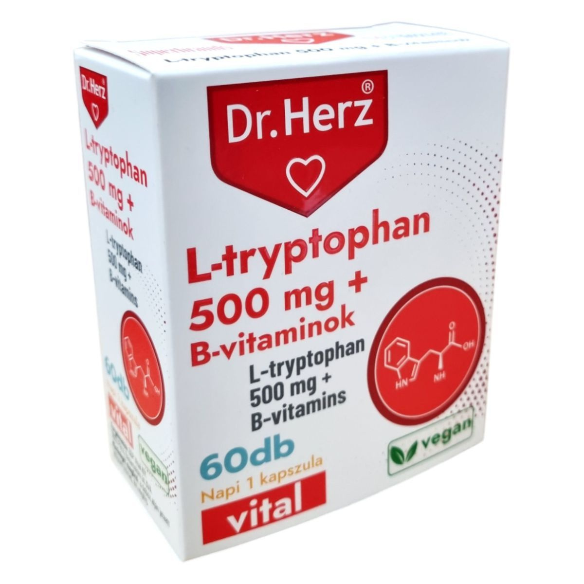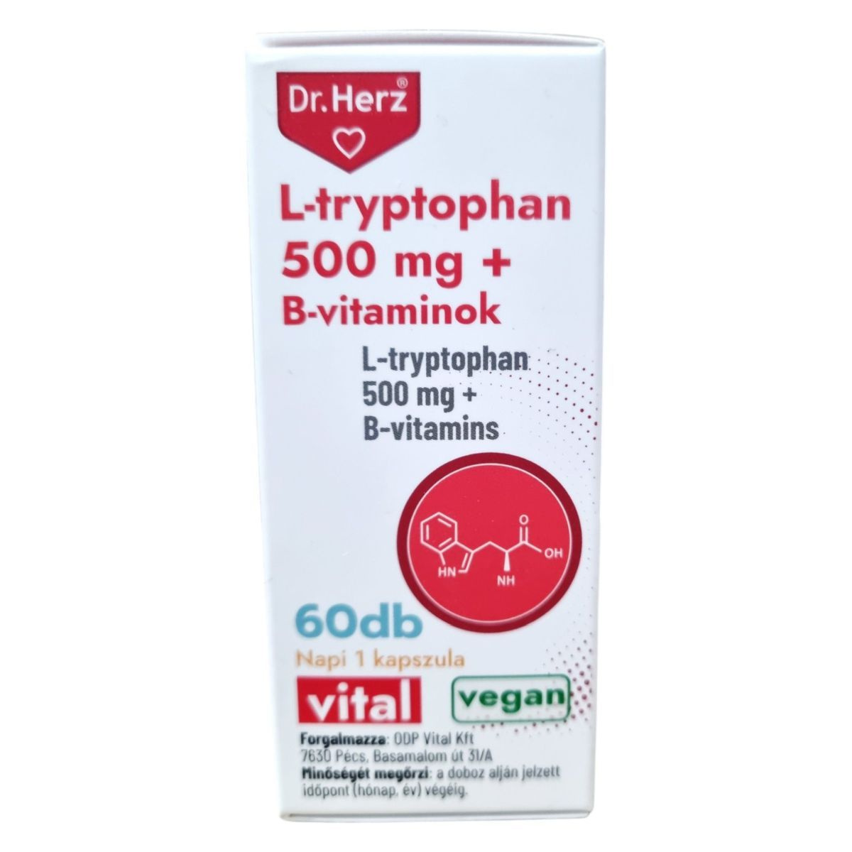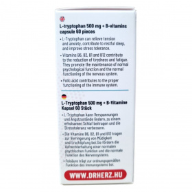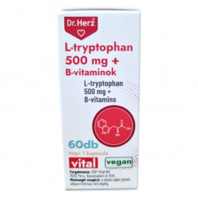A Dr. Herz L-tryptophan 500 mg + B-vitaminok étrend-kiegészítő kapszula 60 db-os kiszerelésben kapható. Az L-tryptophan hozzájárulhat a feszültség és szorongás enyhítéséhez, valamint a pihentető alvás elősegítéséhez. A B6, B2, B1 és B12 vitaminok csökkenthetik a fáradtságot és a kifáradást, elősegíthetik a normál pszichológiai funkció fenntartását és az idegrendszer normál működését. A folsav támogathatja az immunrendszer megfelelő működését. A termék vegán étrendbe illeszthető.