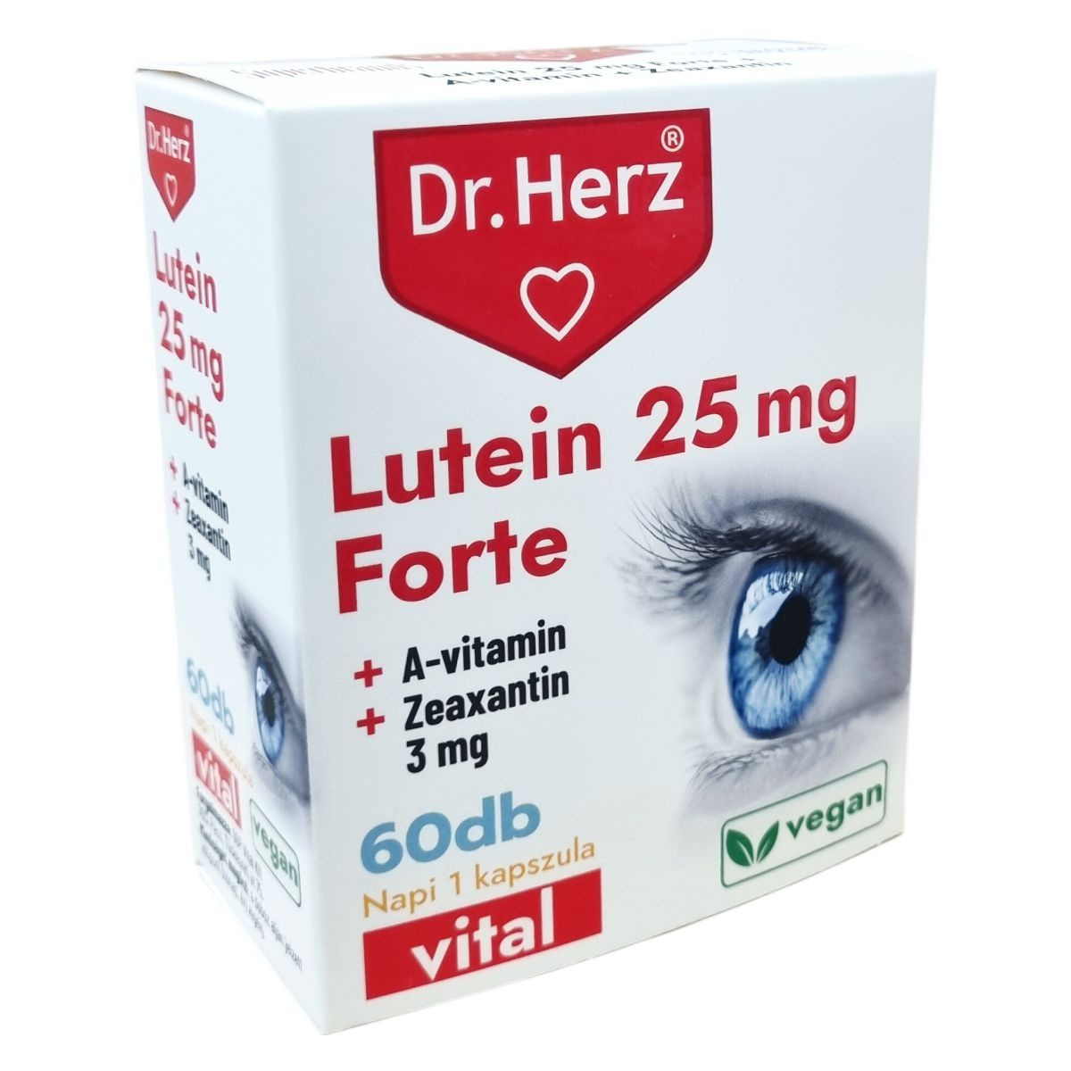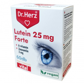 A Dr.Herz Lutein 25 mg Forte + Zeaxantin + Vitamin A kapszula komplex formulája hozzájárulhat a szem egészségének megőrzéséhez, a normál látás fenntartásához és a sejtek oxidatív stresszel szembeni védelméhez. A lutein és a zeaxantin elősegítheti a normál vizuális egészséget azáltal, hogy semlegesítheti az UV-kék fény által előállított szabad gyököket. A-vitamin szerepet játszhat a fény és sötétség közötti különbség felismerésében és hozzájárulhat az egészséges látás fenntartásához. Az ajánlott napi adag egy kapszula, melyet főétkezések előtt kell bevenni bőséges folyadékkal, szétrágás nélkül. A termék összetevői között megtalálhatóak a természetes növényi eredetű anyagok, mikrokristályos cellulóz, kukoricakeményítő és egy növényi eredetű kapszulahéj is. A termék vegán étrendbe illeszthető, és megfelel az OGYÉI előírásainak.