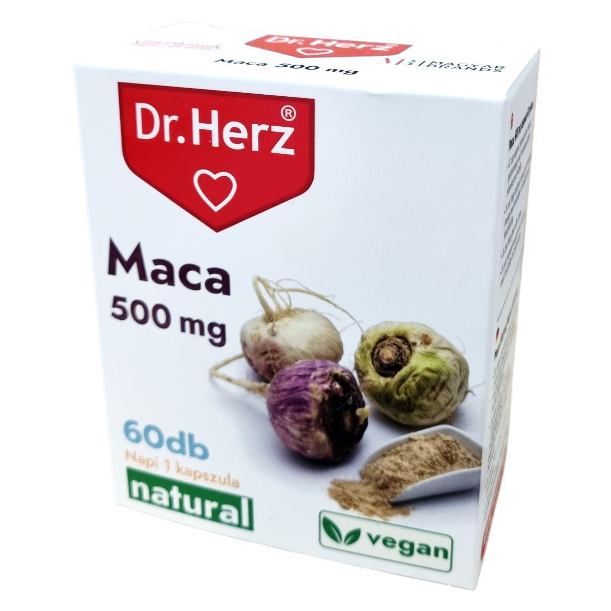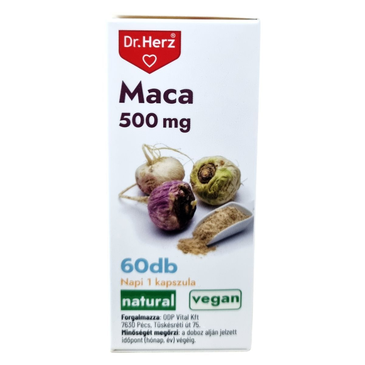 A Dr.Herz Maca kapszula 500 mg maca gyökér kivonatot tartalmaz, amely hozzájárulhat az optimális fizikai és mentális teljesítmény fenntartásához, valamint támogathatja az állóképességet és vitalitást. A termék elősegítheti az egészséges szexuális funkciókat és energiát, valamint a stressz kezelését. A maca gyökér kivonat (10:1 arányú koncentrációban) természetes módon készült, rizskeményítővel töltött kapszulahéjban található. A termék fogyasztása megfelelő lehet azok számára, akik természetes eredetű, vegán étrend-kiegészítőt keresnek az életminőség támogatásához.