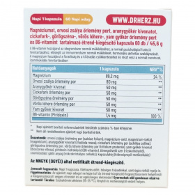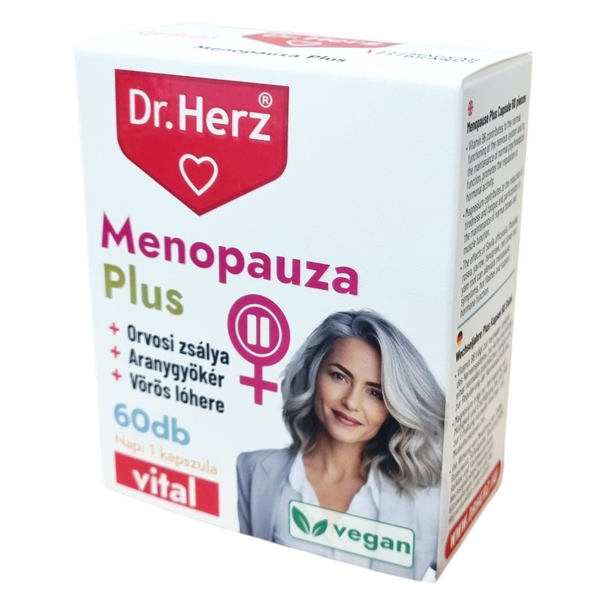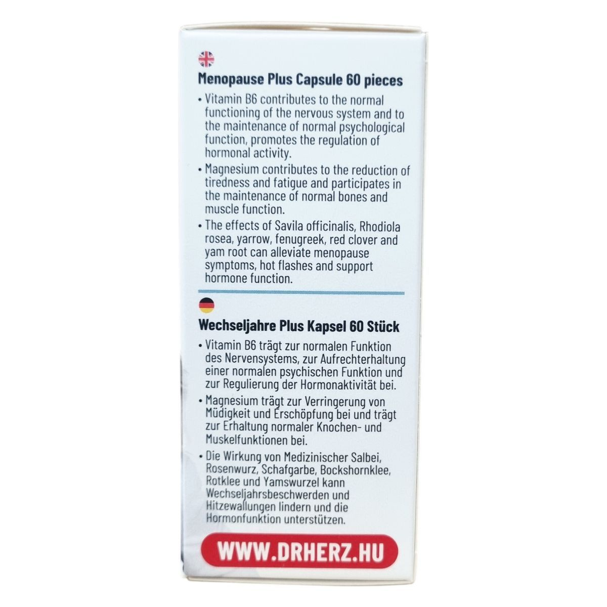 A Dr.Herz Menopauza Plus kapszula olyan vitaminokat és növényi hatóanyagokat tartalmaz, amelyek hozzájárulhatnak az idegrendszer és a pszichológiai funkciók normál működéséhez, valamint a hormonális aktivitás szabályozásához. A B6-vitamin elősegítheti az immunrendszer egészséges működését, míg a magnézium részt vehet a fáradtság csökkentésében és a csontok, izmok normál működésének fenntartásában. Az orvosi zsálya, aranygyökér, cickafark, görögszéna, vörös lóhere és yam gyökér természetes összetevői támogatást nyújthatnak a menopauza kellemetlen tüneteinek enyhítésében, például a hőhullámok csökkentésében és a hormonális egyensúly megőrzésében. A termék vegán összetételű, kapszulahéja növényi alapú, így étkezési szokásokhoz jól illeszthető.