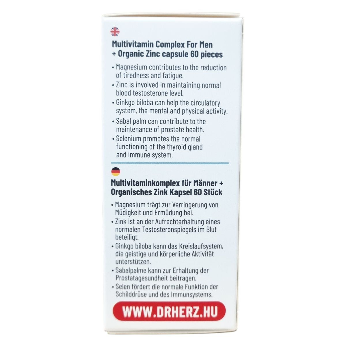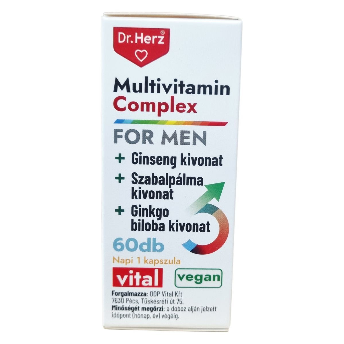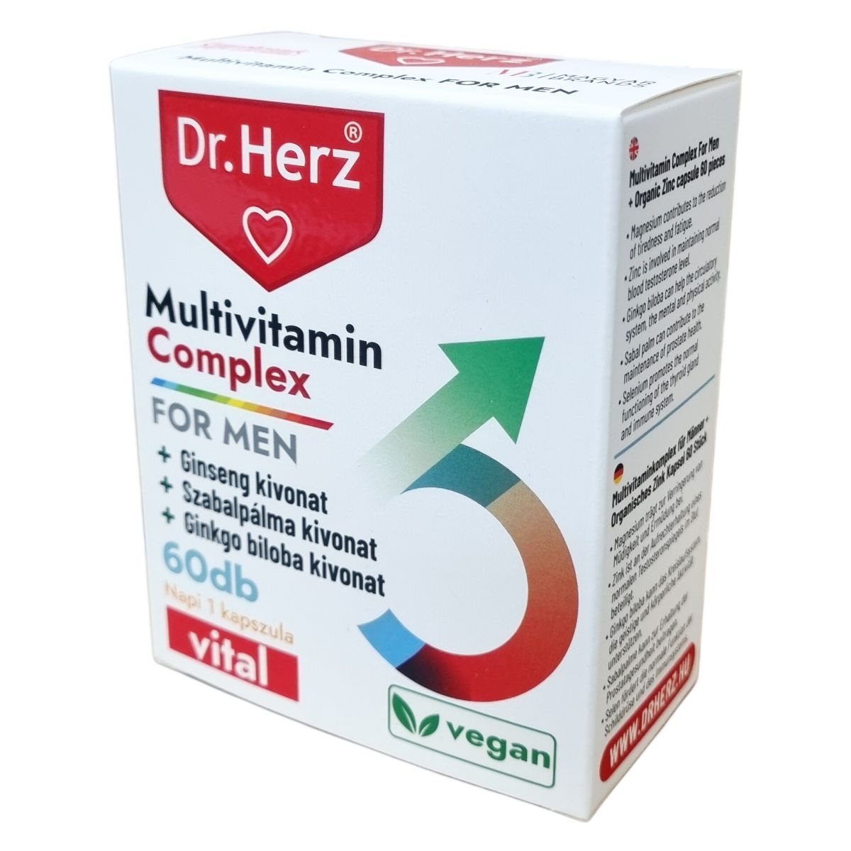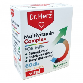 A Multivitamin Complex For Men multivitamin kapszula, amely természetes kivonatokat és ásványi anyagokat tartalmaz, többek között ginseng, szabalpálma és ginkgo biloba kivonatokat. A magnézium hozzájárul a fáradtság csökkentéséhez és az idegrendszer megfelelő működéséhez, míg a cink segítheti a vér normál tesztoszteronszintjének fenntartását és támogathatja a sejtek oxidatív stresszel szembeni védelmét. A szelén elősegítheti a pajzsmirigy és az immunrendszer normál működését. A biotin hozzájárulhat a haj és a bőr egészségéhez, valamint segítheti a pszichológiai funkciók normál működését. A termék napi egy kapszula adagolásával szedhető, és nem helyettesíti a kiegyensúlyozott étrendet és az egészséges életmódot.