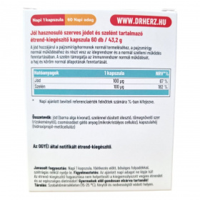 A Dr. Herz Pajzsmirigy Komplex egy jól hasznosuló szerves jódot és szelént tartalmazó étrend-kiegészítő, amely 60 kapszulát tartalmaz. A jód hozzájárulhat a pajzsmirigyhormonok normál termeléséhez és a pajzsmirigy normál működéséhez, valamint részt vehet az idegrendszer és a normál szellemi működés fenntartásában. A szelén támogathatja az immunrendszer normál működését, valamint a haj és köröm normál állapotának fenntartását. A termék vegán étrendbe illeszthető, és az OGYÉI által notifikált étrend-kiegészítő.