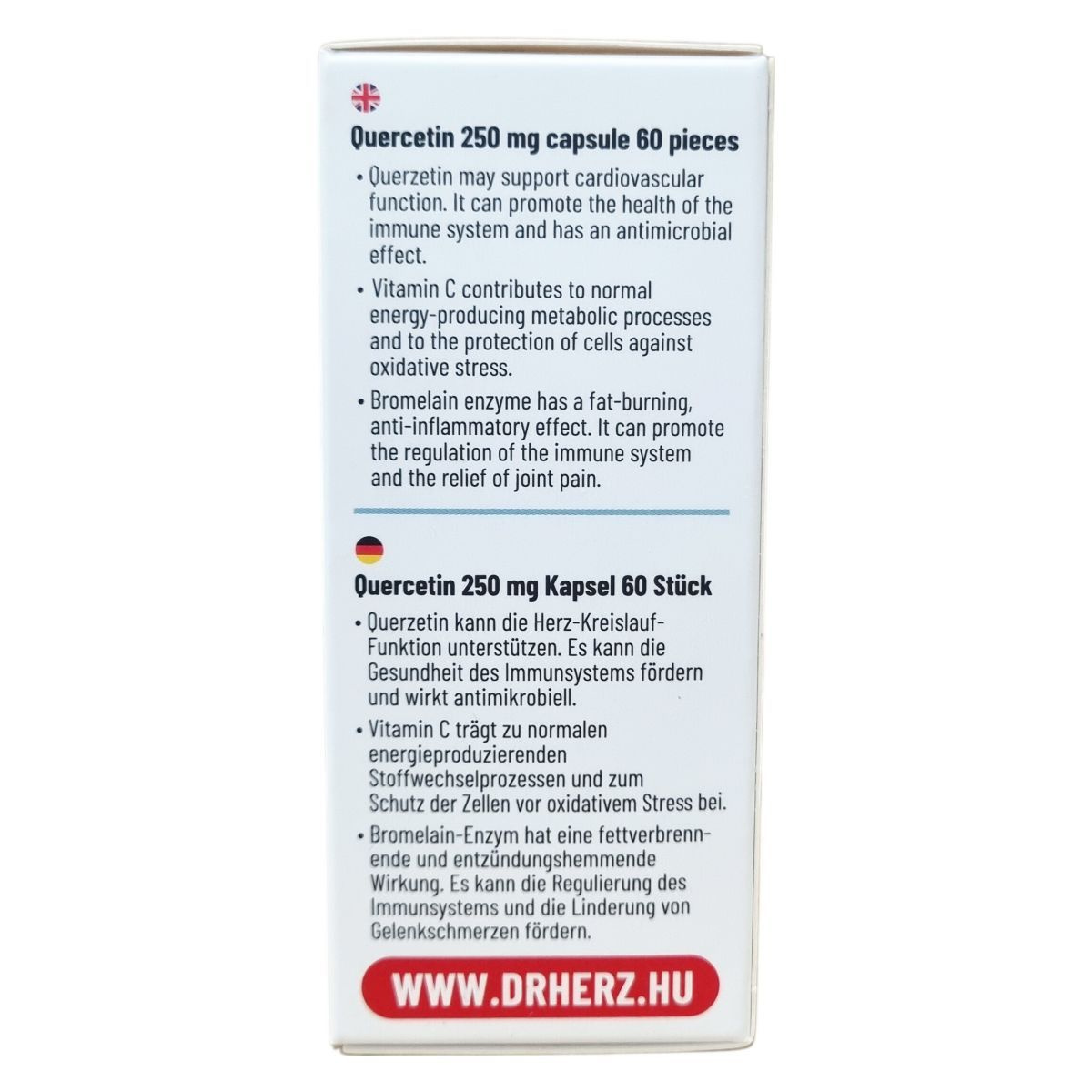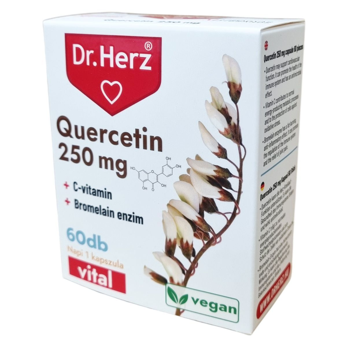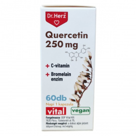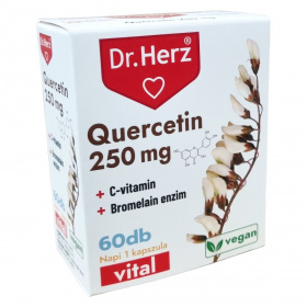 A Dr.Herz® Quercetin 250 mg + C-vitamin + Bromelain enzim kapszula egy olyan étrend-kiegészítő, amely egyenletesen biztosítja a hatóanyagokat naponta. A quercetin hozzájárulhat a szív- és érrendszer működéséhez, támogathatja az immunrendszer egészségét és antimikrobiális hatással bírhat. A C-vitamin szerepet játszik a normál energiatermelő anyagcsere-folyamatokban és a sejtek oxidatív stresszel szembeni védelmében, továbbá csökkentheti a fáradtság érzetét és támogathatja a bőr kollagén képződését, amely fontos a porcok egészségéhez. A bromelain enzim gyulladáscsökkentő és zsírégető hatású lehet, továbbá segítheti az immunrendszer szabályozását és az ízületi fájdalom enyhítését. A termék vegán és bio minősítésű, kapszulahéja növényi eredetű, így különböző étrendekbe is jól illeszthető.