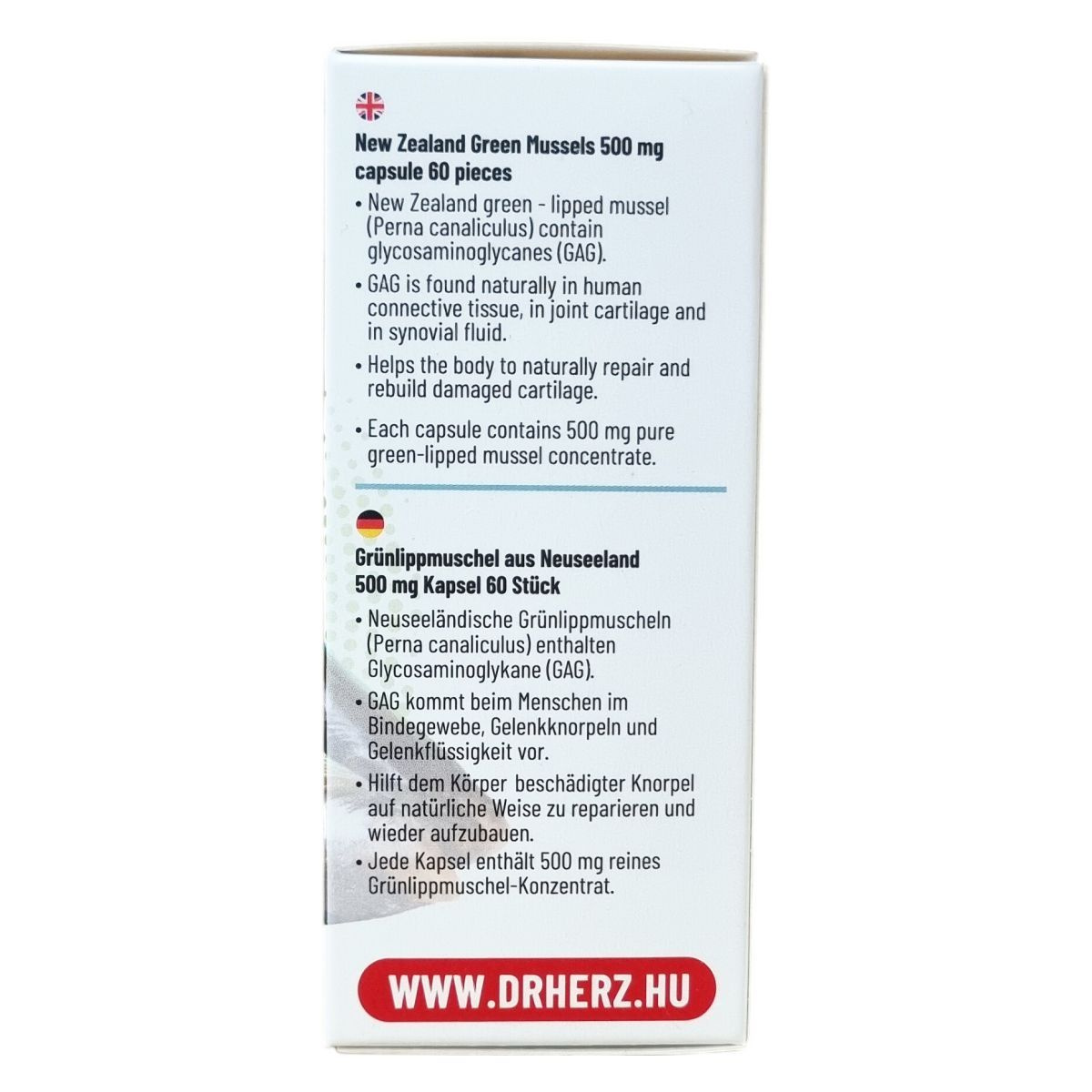 A Dr.Herz Új-Zélandi Zöldkagyló készítmény az Új-Zéland környékén honos tarajos zöldkagyló (Perna canaliculus) kivonatát tartalmazza, melynek fő hatóanyaga a glükozaminoglikán (GAG). A GAG természetesen előfordul az emberi kötőszövetekben, ízületi porcszövetben és szinoviális folyadékban. Ez az összetevő segítheti a szervezet természetes folyamatát a sérült porc javításában és újjáépítésében. Minden kapszula 500 mg tiszta zöldkagyló-koncentrátumot tartalmaz. Az étrend-kiegészítő napi két kapszulás adagolása javasolt.