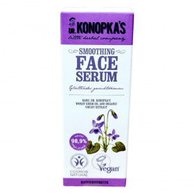 Dr. Konopka's legkisebb gyógynövényboltjában gondosan gyűjtött és generációkon át őrzött gyógyító növényeken alapuló receptek találhatók. A feszesítő arcszérumnak alapját képező búzacsíra-olaj magas E-vitamin és többszörösen telítetlen zsírsav tartalommal rendelkezik, mely elengedhetetlen a teljes körű bőrápoláshoz, hidratáló és helyreállító hatásaival segíti a bőr regenerálódását. Az organikus ibolya kivonat támogatja a bőr textúrájának megújulását és fiatalítja az arcszínt, eltüntetve a kisebb egyenetlenségeket. A termék a Cosmos Natural minősítésnek és a vegán natúrkozmetikum követelményeinek egyaránt megfelel, így a természetes és vegán életmódot követők is biztonsággal használhatják.