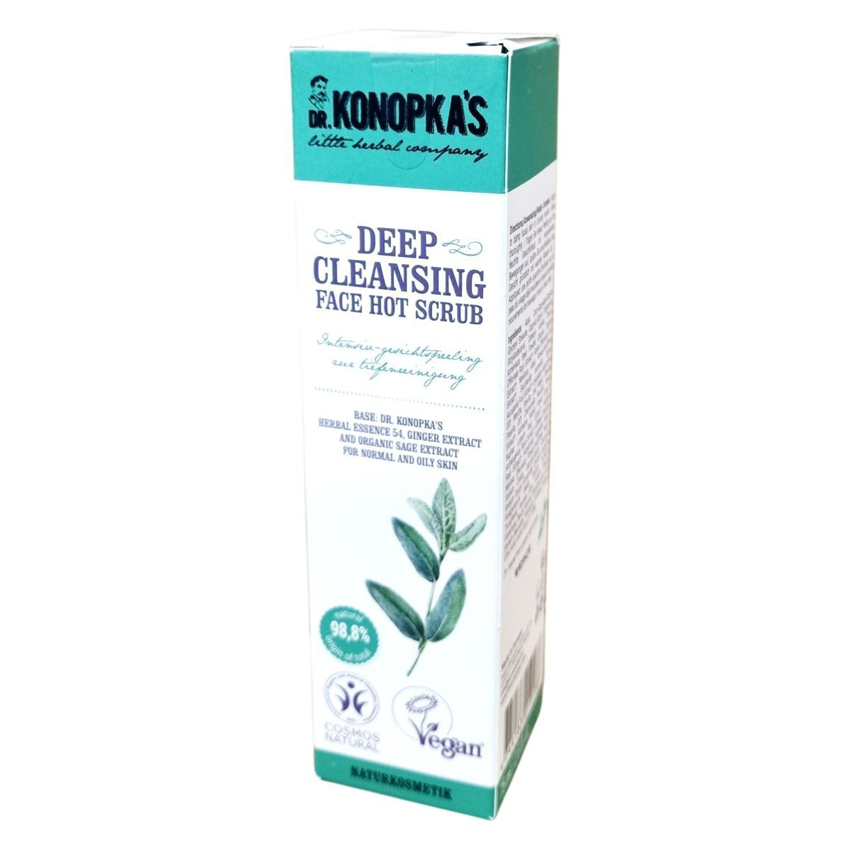 A Dr. Konopka's termékek egy kis hagyományos gyógynövényboltból származnak, ahol évszázadokon át gyűjtött növényi alapú, vitalizáló recepteket őriznek. Ez az intenzív arcradír a különleges 54-es növényi esszencián alapul, amely segíti a bőr hámlasztását, mélytisztítását és megújítását. A gyömbér és a szerves zsályakivonat együttesen tonizáló és frissítő hatású, elősegítve a bőr simaságát és feszességét. Természetes összetevőinek aránya 98,8%, normál és zsíros bőrre ajánlott. A termék vegán és természetes kozmetikumként minősített, és Európában készült.
