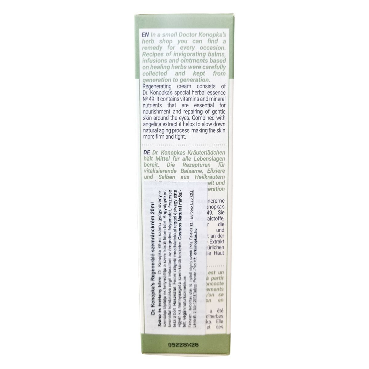 A Dr. Konopka’s regeneráló szemránckrém Dr. Konopka speciális gyógynövényes esszenciáján alapul, amely vitaminokat és ásványi anyagokat tartalmaz. Ezek elengedhetetlenek a szem körüli finom bőr táplálásához és regenerálásához. Az angyalgyökér kivonattal kombinálva segít lassítani a természetes öregedési folyamatokat, valamint feszesebb és teltebb megjelenést kölcsönöz a bőrnek. A termék 98,9%-ban természetes eredetű összetevőket tartalmaz, Európában készült.