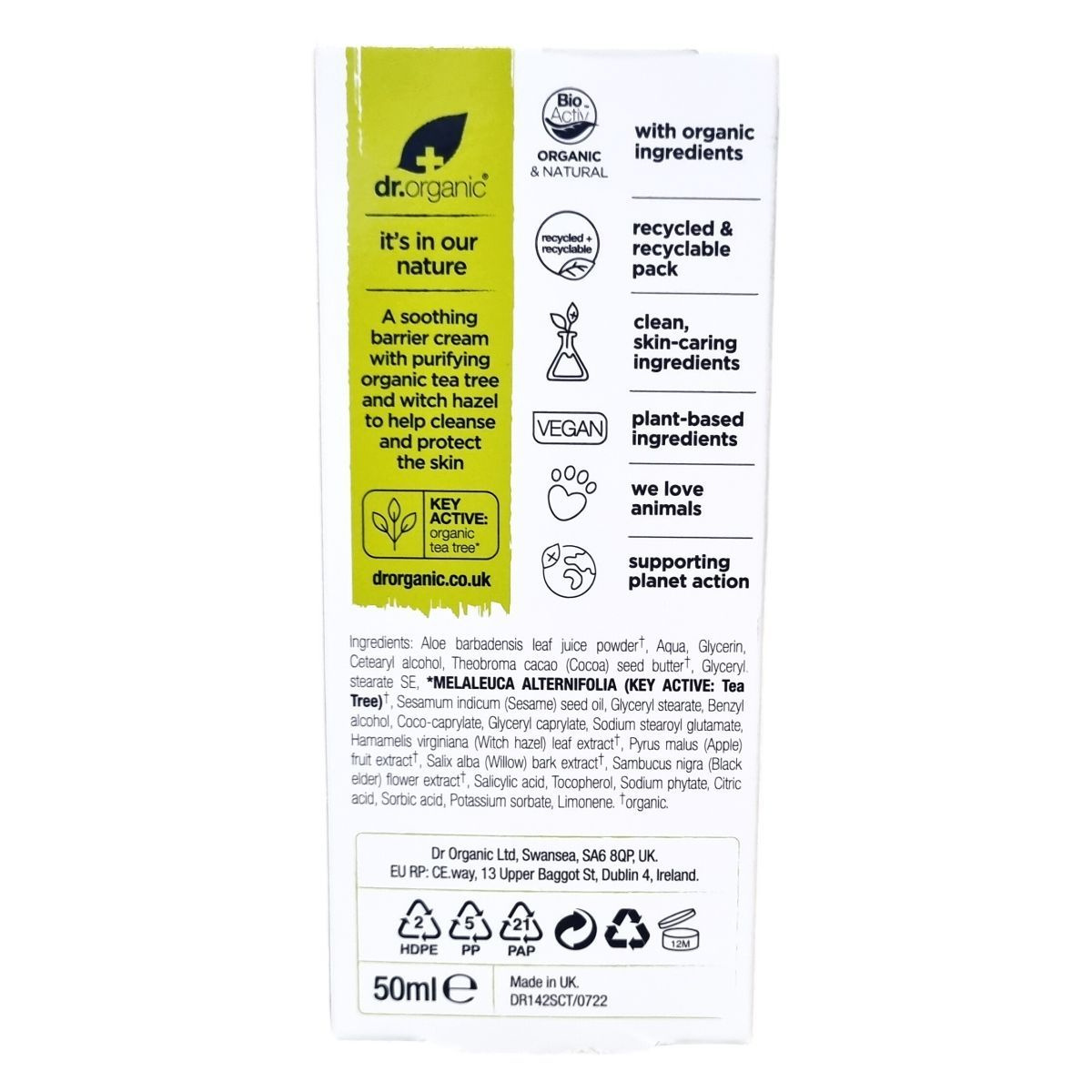 Ez a nyugtató gátkrém bio teafa- és varázsmogyoró-kivonatot tartalmaz, amely segít a bőr tisztításában és védelmében. A termék növényi eredetű összetevőkkel készült, csomagolása újrahasznosított és újrahasznosítható anyagokból áll. A krém vegán, állatkísérlet-mentes és a természet tiszteletével fejlesztették ki, támogatva a bolygó védelmét is.