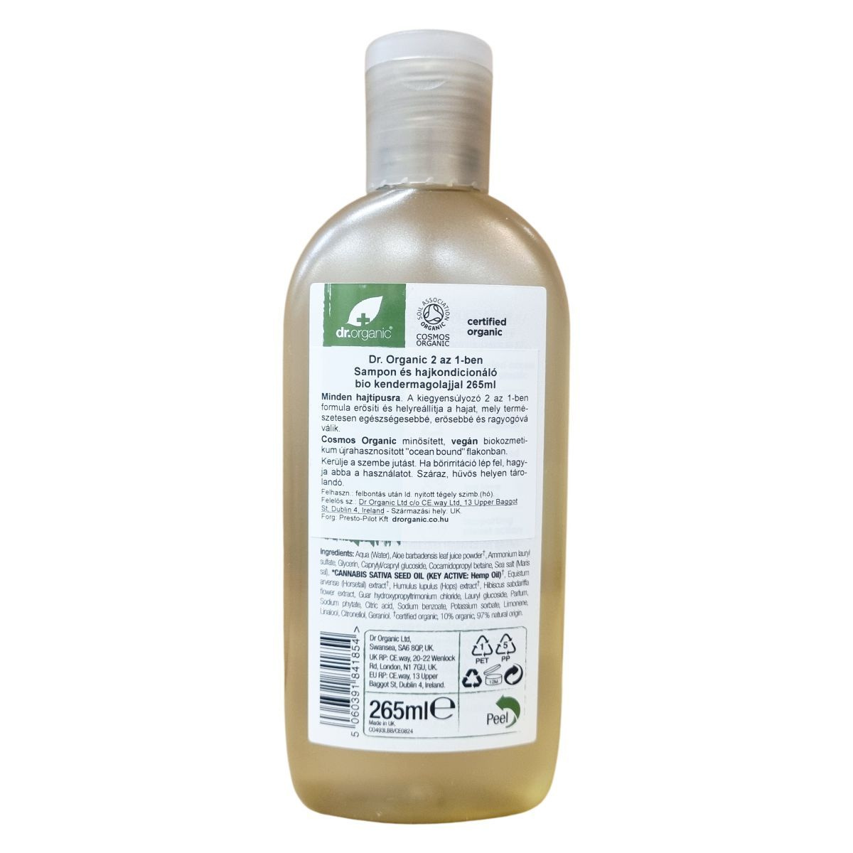 A dr.organic Hemp Oil 2in1 Sampon és Kondicionáló egy 265 ml-es vegán biokozmetikum Cosmos Organic minősítéssel, mely bio kendermagolajjal készült és minden hajtípus számára ajánlott. A kiegyensúlyozó formula erősíti és helyreállítja a hajat, ezáltal az természetesen egészségesebbé, erősebbé és ragyogóbbá válik. A termék újrahasznosított, "ocean bound" flakonban került forgalomba, hozzájárulva a fenntarthatósághoz. A termék felbontás után a csomagoláson jelzett hőszimbólum alapján használható. Gyártási helye az Egyesült Királyság.
