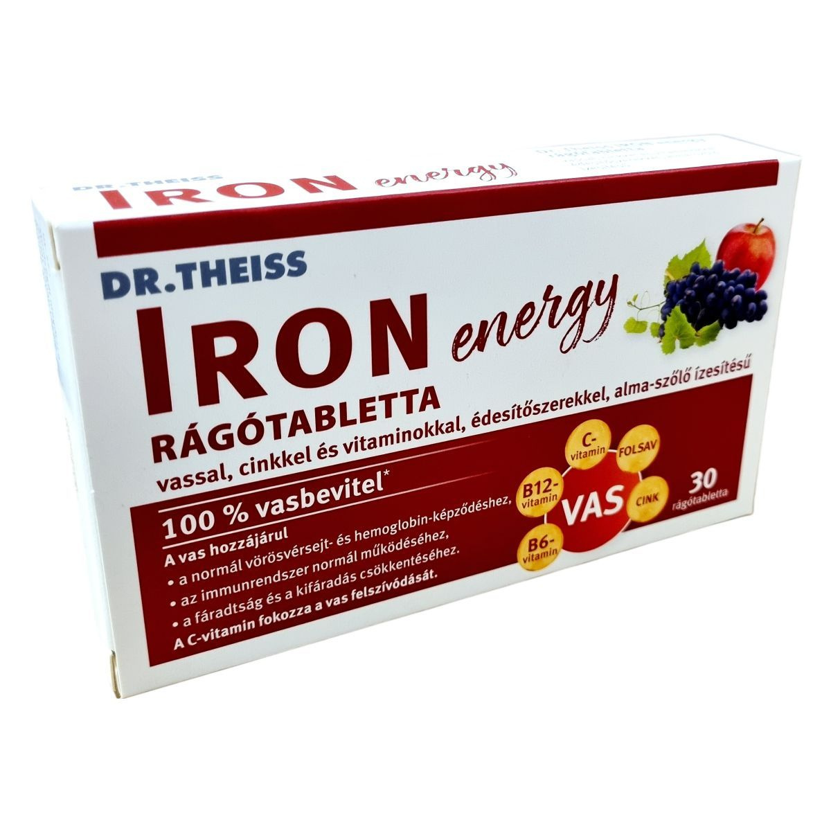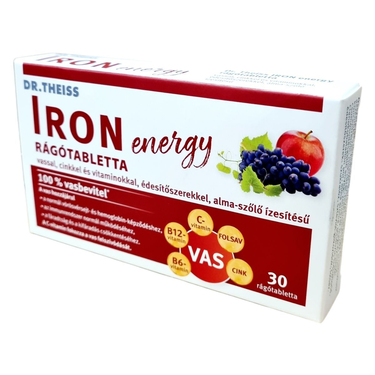 A Dr. Theiss IRON energy étrend-kiegészítő rágótabletta vasat, cinket és B-vitaminokat tartalmaz, továbbá C-vitaminnal került kiegészítésre, amely fokozhatja a vas felszívódását. A folsav, valamint a B6- és B12-vitaminok hozzájárulhatnak a normál vörösvérsejt-képződéshez, míg a vas, a folsav, a C-, a B6- és a B12-vitaminok támogatni segíthetik a fáradtság és kifáradás csökkentését, valamint az immunrendszer normál működését. A cink hozzájárulhat a sejtek oxidatív stresszel szembeni védelméhez és az immunrendszer támogatásához. A termék édesítőszereket tartalmaz, alma és szőlő aroma ízesítéssel készült, így kellemes rágótabletta formájában segítheti a napi tápanyagbevitelt.