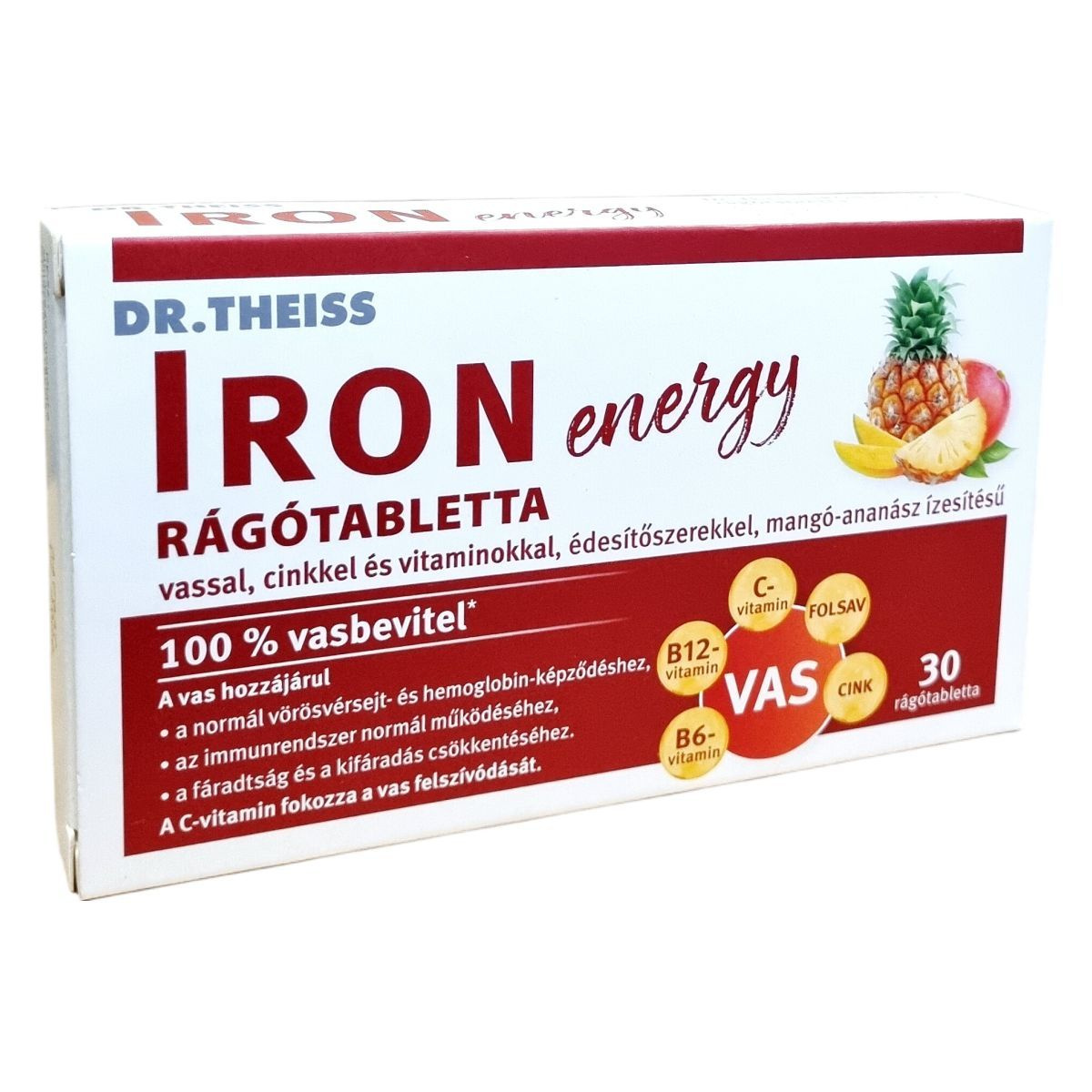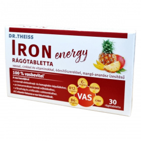 A Dr. Theiss IRON energy rágótabletta mangó-ananász ízesítésű étrend-kiegészítő, amely vasat, cinket és különböző vitaminokat tartalmaz. A termék célja, hogy támogassa a normál vörösvérsejt- és hemoglobin-képződést, az immunrendszer normál működését, valamint csökkentse a fáradtságot és a kifáradást. A C-vitamin fokozhatja a vas felszívódását, míg a cink hozzájárulhat a sejtek oxidatív stresszel szembeni védelméhez. A termék felnőttek számára készült, és napi egy rágótabletta fogyasztása javasolt.