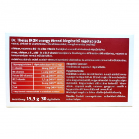 A Dr. Theiss IRON energy rágótabletta vasat, cinket és vitaminokat tartalmaz, amelyek hozzájárulhatnak a normál vörösvérsejt- és hemoglobin-képződéshez, az immunrendszer normál működéséhez, valamint a fáradtság csökkentéséhez.