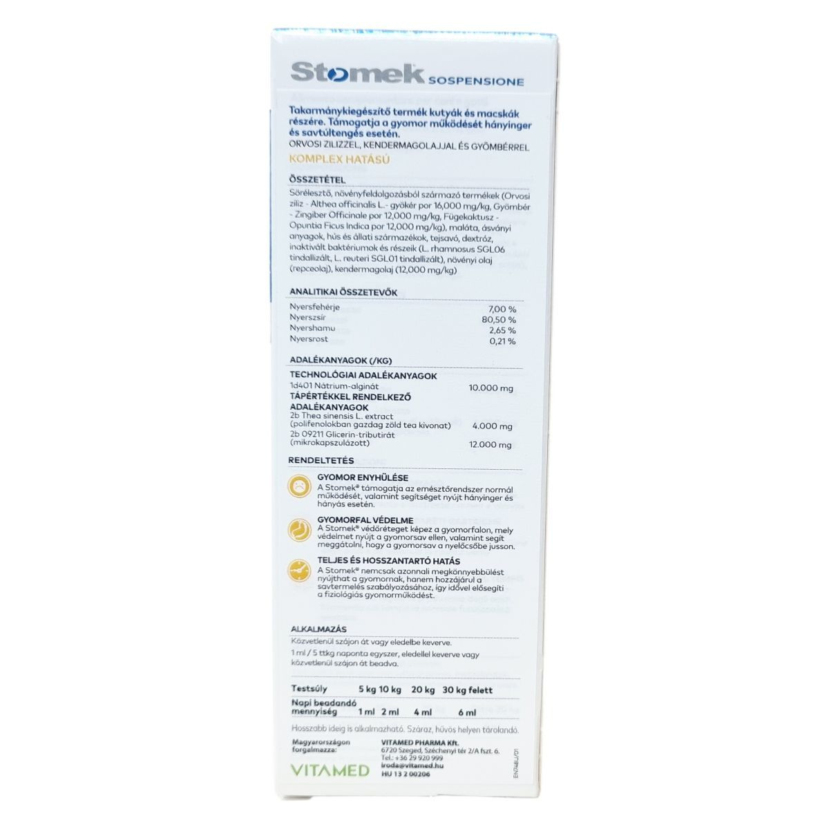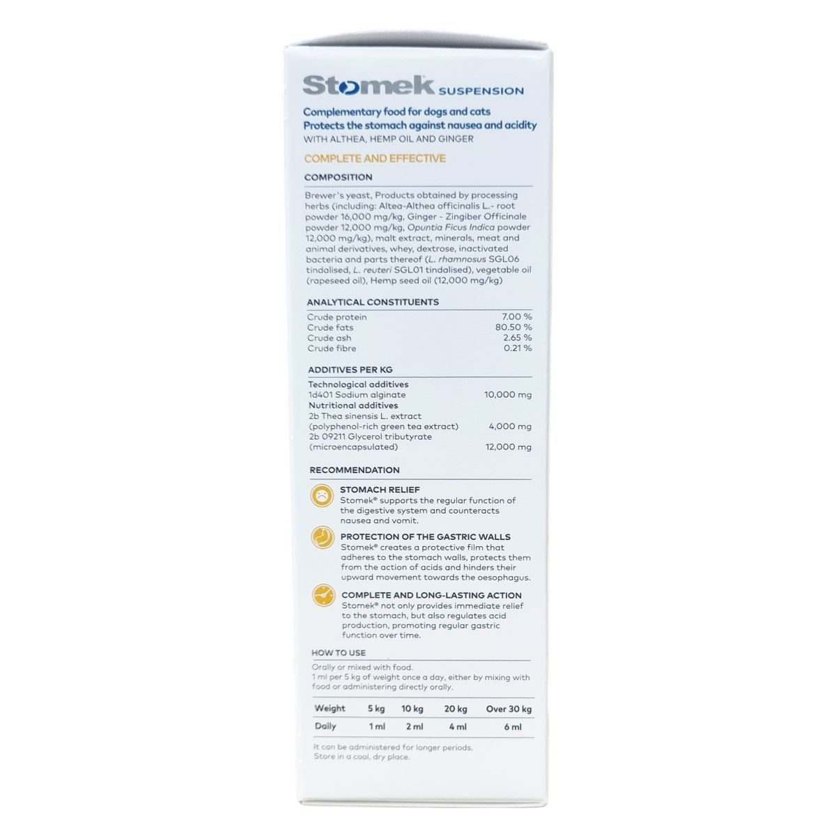 A Stomek® egy takarmánykiegészítő, amely kifejezetten kutyák és macskák részére készült, és a gyomor működésének támogatására szolgál. A készítmény összetevői között megtalálható az orvosi ziliz (Althea officinalis L.) gyökér, a gyömbér (Zingiber Officinale) és a fügektaktusz (Opuntia Ficus Indica), valamint kendermagolaj, maláta, ásványi anyagok, hús- és állati származékok, sörelesztő, tejsavó és inaktivált probiotikus baktériumok. A termék úgy fejti ki hatását, hogy védőréteget képez a gyomorfalon, amely megóvhatja a gyomrot a savtúltengéstől és segítheti a savtermelés szabályozását, továbbá támogatja az emésztőrendszer normál működését. A Stomek® napi adagolással, közvetlenül vagy eledelbe keverve adható a kedvenceknek és hosszabb ideig is alkalmazható, figyelembe véve a testtömeg szerint meghatározott adagokat. A termék olasz gyártású, 50 ml-es kiszerelésben kapható, és a használat előtt fel kell rázni.
