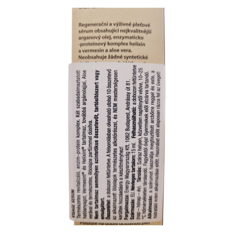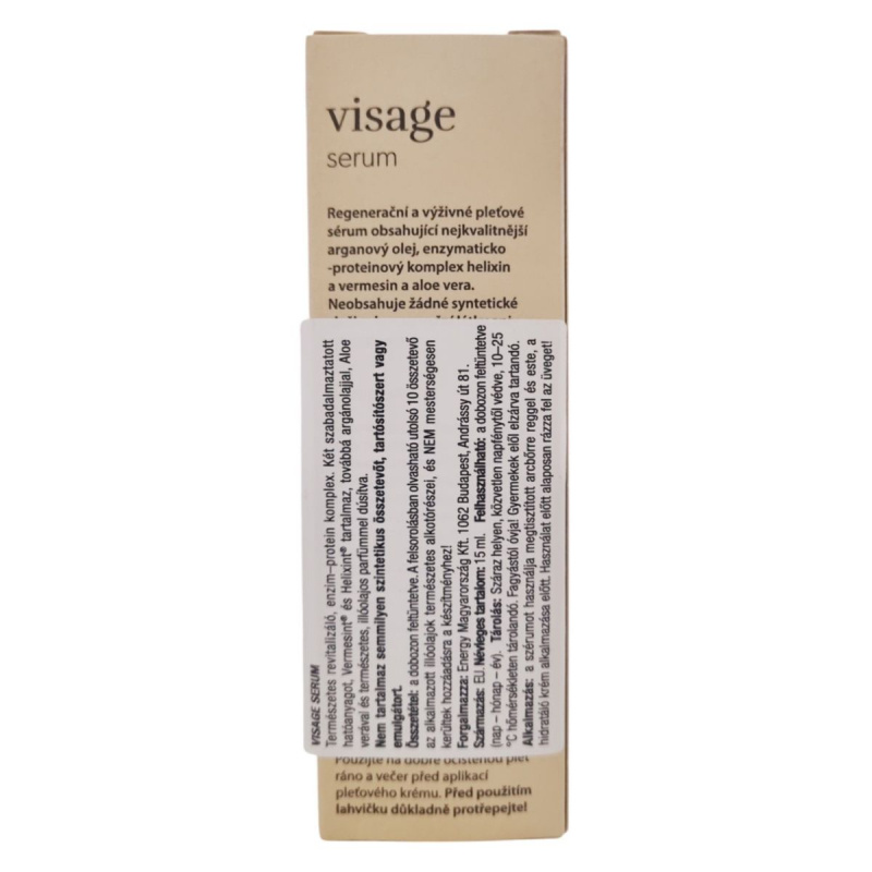 A Visage Serum egy regenerační és výživné pleťové szérum, amely a legkiválóbb minőségű argánolajat, valamint egy enzimatikus-protein komplexet, helixint és vermesint tartalmazhat. A termék Aloe verával és természetes illóolajos parfümmel van dúsítva, és nem tartalmaz szintetikus összetevőket. A szérum célja a bőr revitalizálása és táplálása, hozzájárulhat a bőr természetes egyensúlyának fenntartásához. Tárolása száraz helyen, közvetlen napfénytől védve ajánlott, 10–25 °C hőmérséklet között, gyermekektől elzárva.