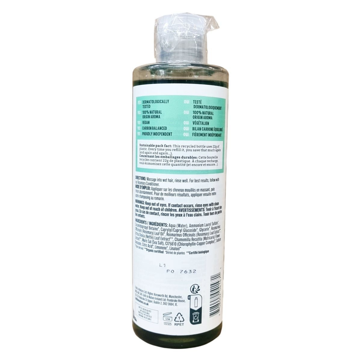 Aqua (Water), Ammonium Lauryl Sulfate*, Cocamidopropyl Betaine*, Caprylyl/Capryl Glucoside*, Glycerin*, Rosmarinus Officinalis (Rosemary) Leaf Oil*, Rosmarinus Officinalis (Rosemary) Leaf Extract*, Urtica Dioica (Nettle) Leaf Extract*, Chamomilla Recutita (Matricaria) Flower Extract*, Maris Sal (Sea Salt), CI75810 (Chlorophyllin-Copper Complex), Sodium Benzoate, Citric Acid*, Limonene*, Linalool*