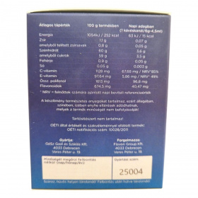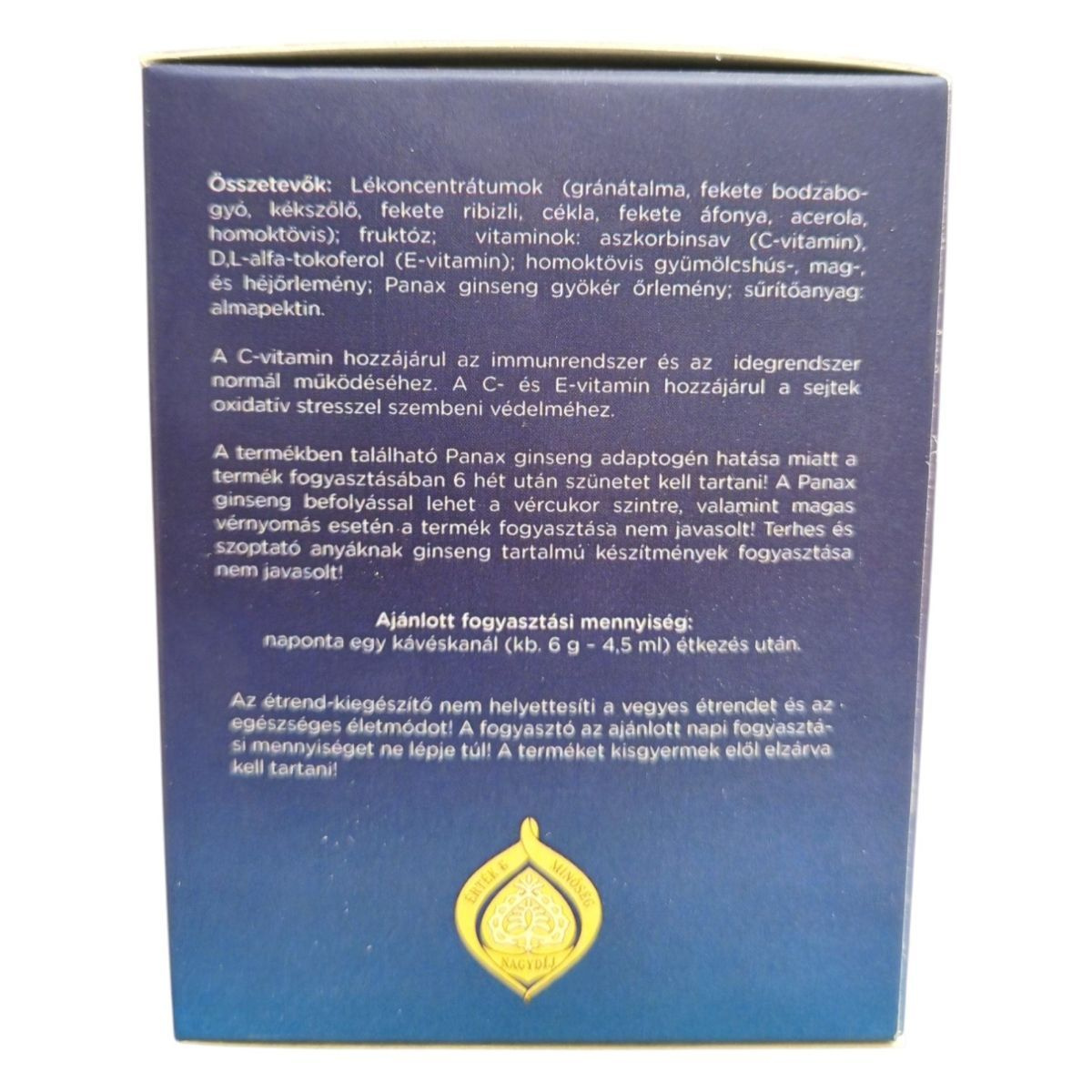 Lékoncentrátumok (gránátalma, fekete bodzabogyó, kékszőlő, fekete ribizli, cékla, fekete áfonya, acerola, homoktövis); fruktóz; vitaminok: aszkorbinsav (C-vitamin), D,L-alfa-tokoferol (E-vitamin); homoktövis gyümölcshús-, mag- és héjőrlemény; Panax ginseng gyökér őrlemény; sűrítőanyag: almapektin.
