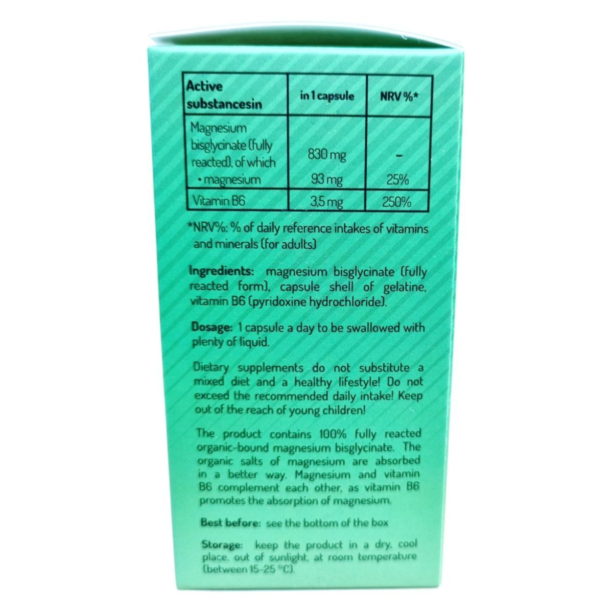 Magnézium-biszglicinát (teljesen reagált formában), zselatin kapszulahéj, B6-vitamin (piridoxin-hidroklorid).
