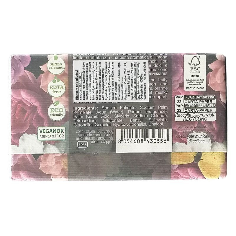 Blossom noir 200g gyümölcsös-virágos szappan, illatjegyét a citrom és a damaszkuszi rózsa alkotják, szívjegyét fehér virágok, narancsvirág és a tubarózsa képezik.