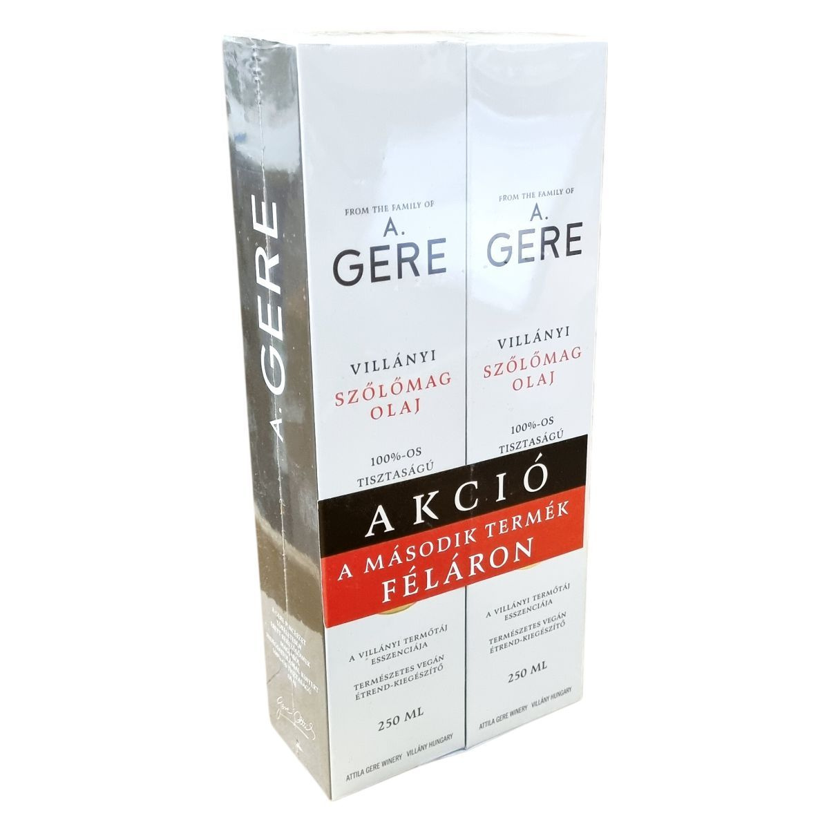 A Gere Pincészet családjából származó Villányi Szőlőmag Olaj 100%-os tisztaságú, hidegsajtolt olaj, mely a Villányi termőtáj esszenciáját hordozza. Az olaj aromás illata enyhe étvágygerjesztő hatású, és jól harmonizál a saláták ízhatásával. Kiválóan alkalmas salátákhoz, hidegkonyhai készítményekhez, illetve pirított kenyérrel fogyasztva is élvezhető. Egy üveg (228 g) körülbelül két havi adagot jelent. Származási helye Magyarország.