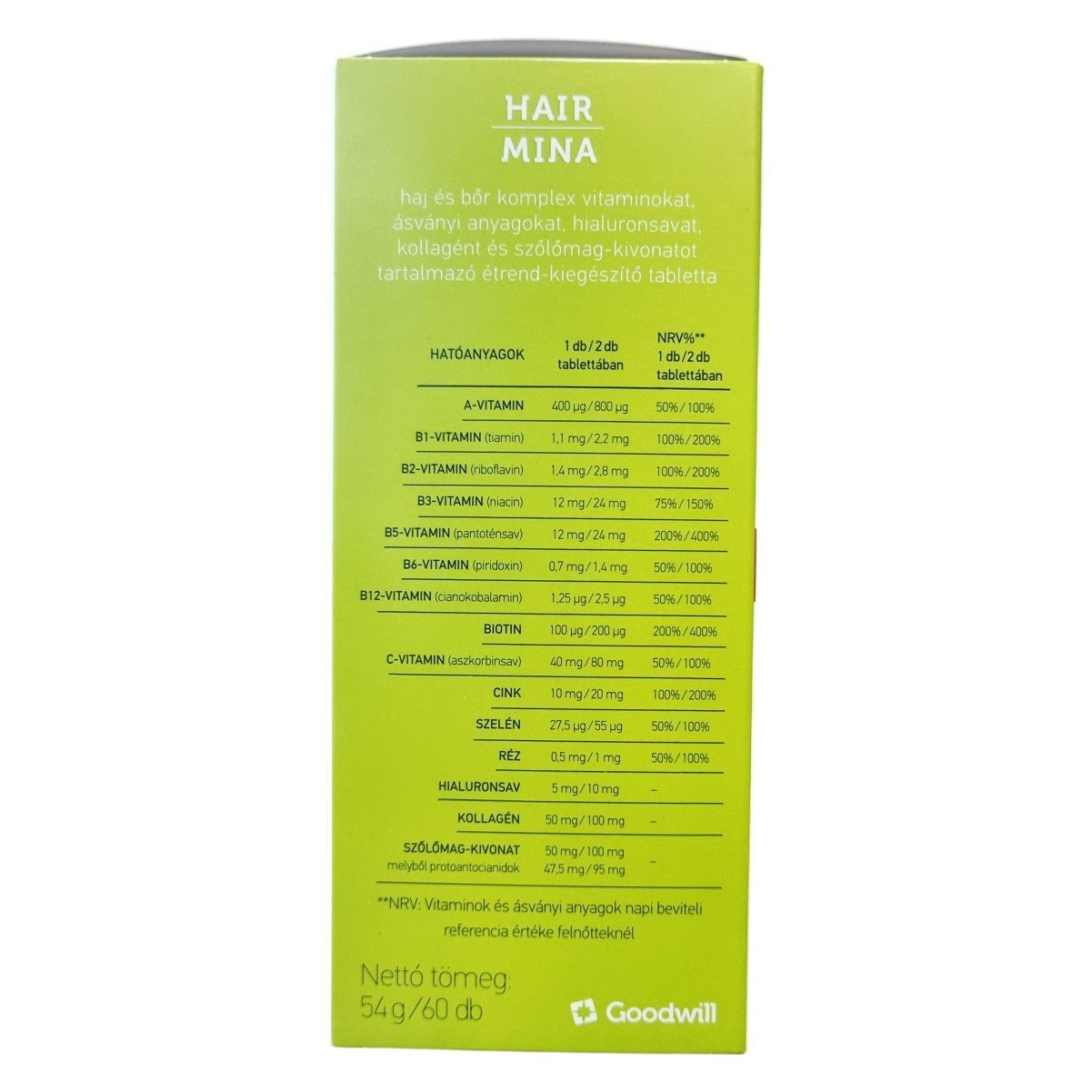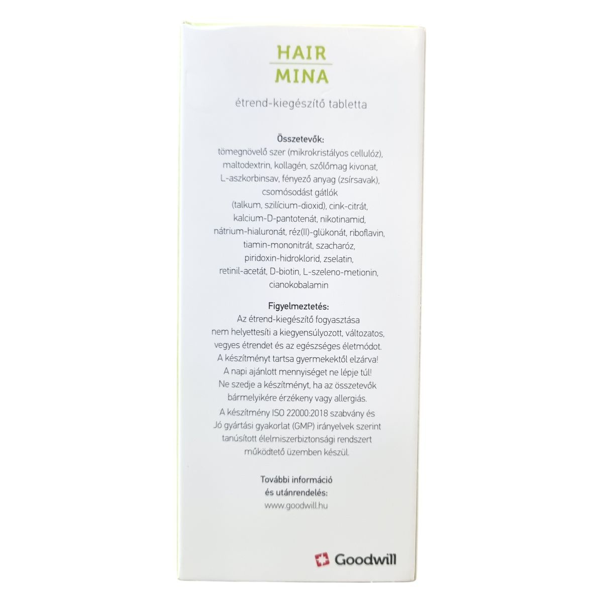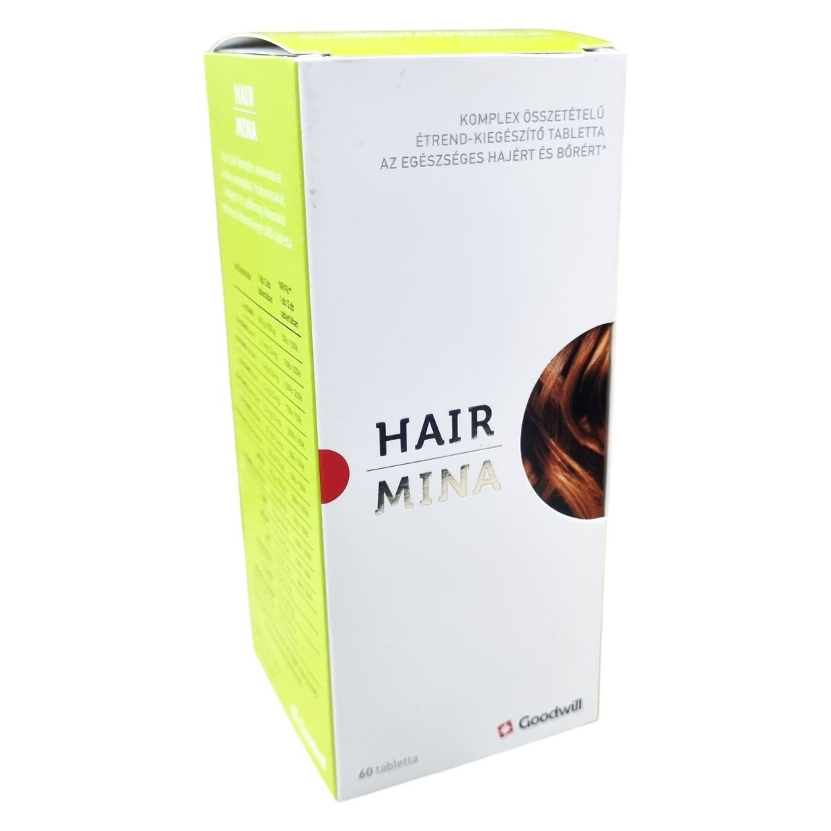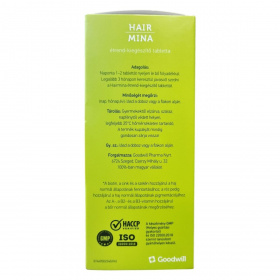 A Hair Mina étrend-kiegészítő tabletta biotint, cinket és szelént tartalmaz, melyek hozzájárulhatnak a haj normál állapotának fenntartásához, valamint rezet, amely hozzájárulhat a haj normál pigmentációjához. Az A-, B2- és B3-vitaminok támogathatják a bőr normál állapotának megőrzését. A készítmény GMP (Helyes gyártási gyakorlat) és ISO 22000:2018 szabvány szerint tanúsított gyártóhelyen készül, megőrzendő a minőségét a doboz vagy a flakon alján feltüntetett jelzés szerint. Forgalmazója a 100%-ban magyar tulajdonú Goodwill Pharma Nyrt., amely biztosítja a termék magas minőségét és biztonságát.