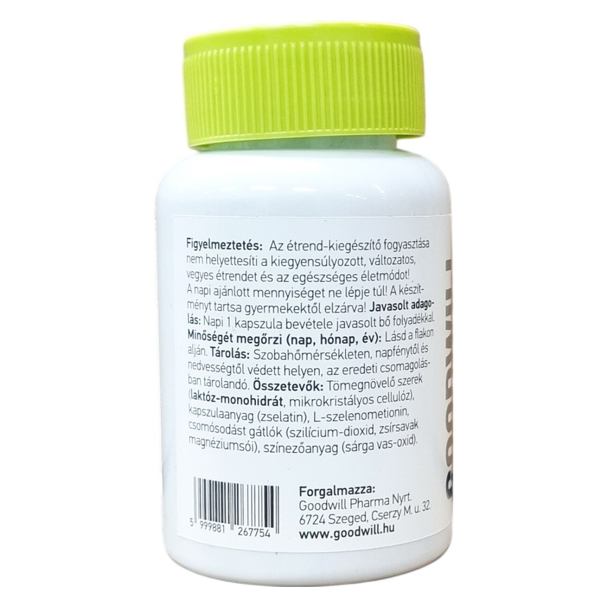 A Goodwill Life Organikus Szelén kapszula szelént tartalmaz, amely 100 µg mennyiségben van jelen egy kapszulában. A szelént L-szelenometionin formájában, szerves kötésű komponensként tartalmazza, mely magas biohasznosulással rendelkezik. A termék 60 darab kapszulát foglal magában, nettó tömege 25,6 g. Az összetevők között megtalálhatók a tömegnövelő szerek, kapszulaanyag, csomósodást gátlók és színezőanyagok is. Javasolt adagja napi 1 kapszula, amely bő folyadékkal bevehető. Fontos, hogy a készítmény nem helyettesíti a változatos és kiegyensúlyozott étrendet, valamint az egészséges életmódot, ezen felül gyermekektől elzárva kell tárolni.