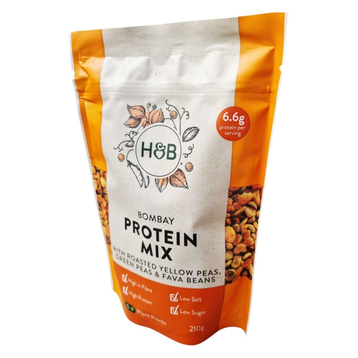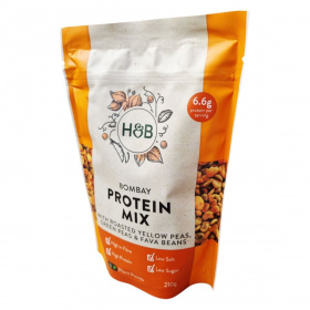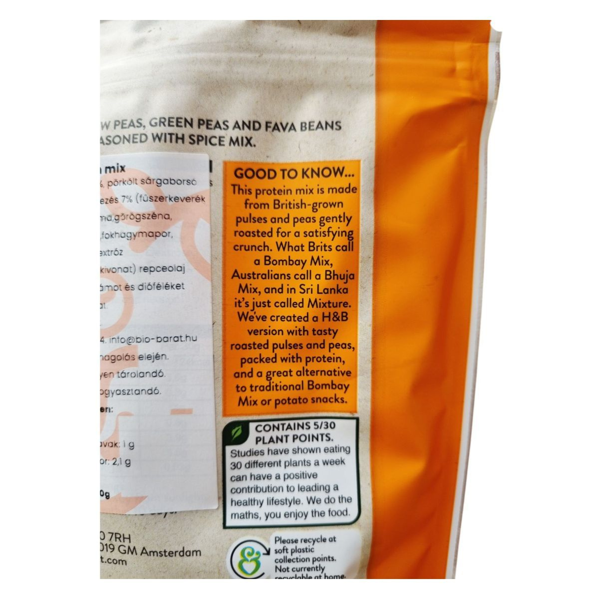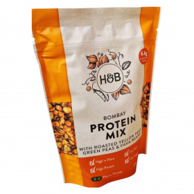 A Bombay Protein mix brit termesztésű hüvelyesekből és borsóból készült ropogós, indiai jellegű fűszerezésű keverék. Magas fehérjetartalmú, pörköléssel készült termék.
