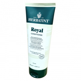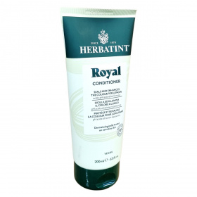 A Herbatint Royal Kondicionáló savas pH-értékű, regeneráló formula, amely hosszabb ideig zárja és erősíti a haj színét. Az Aloe Vera különösen tápláló és helyreállító hatású, míg a jojoba olaj kondicionálja a hajat, megkönnyítve a fésülést. Termék érzékeny bőrön is dermatológiailag tesztelt, környezettudatos csomagolásban, amely 70%-ban újrahasznosított műanyagból készült. 96%-ban természetes eredetű összetevőket tartalmaz, és vegán formulájával támogatja a haj egészségét minden típus számára, különösen a száraz, gyenge vagy festett hajat.