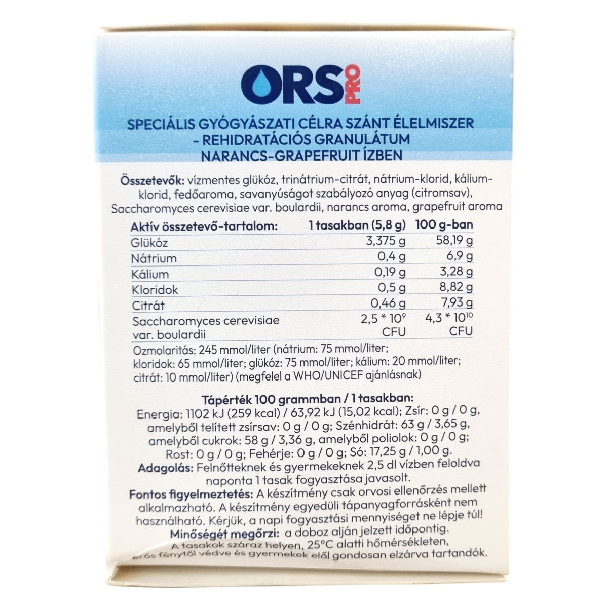vízmentes glükóz, trinátrium-citrát, nátrium-klorid, kálium-klorid, fedőaroma, citromsav, Saccharomyces cerevisiae var. boulardii, narancs aroma, grapefruit aroma