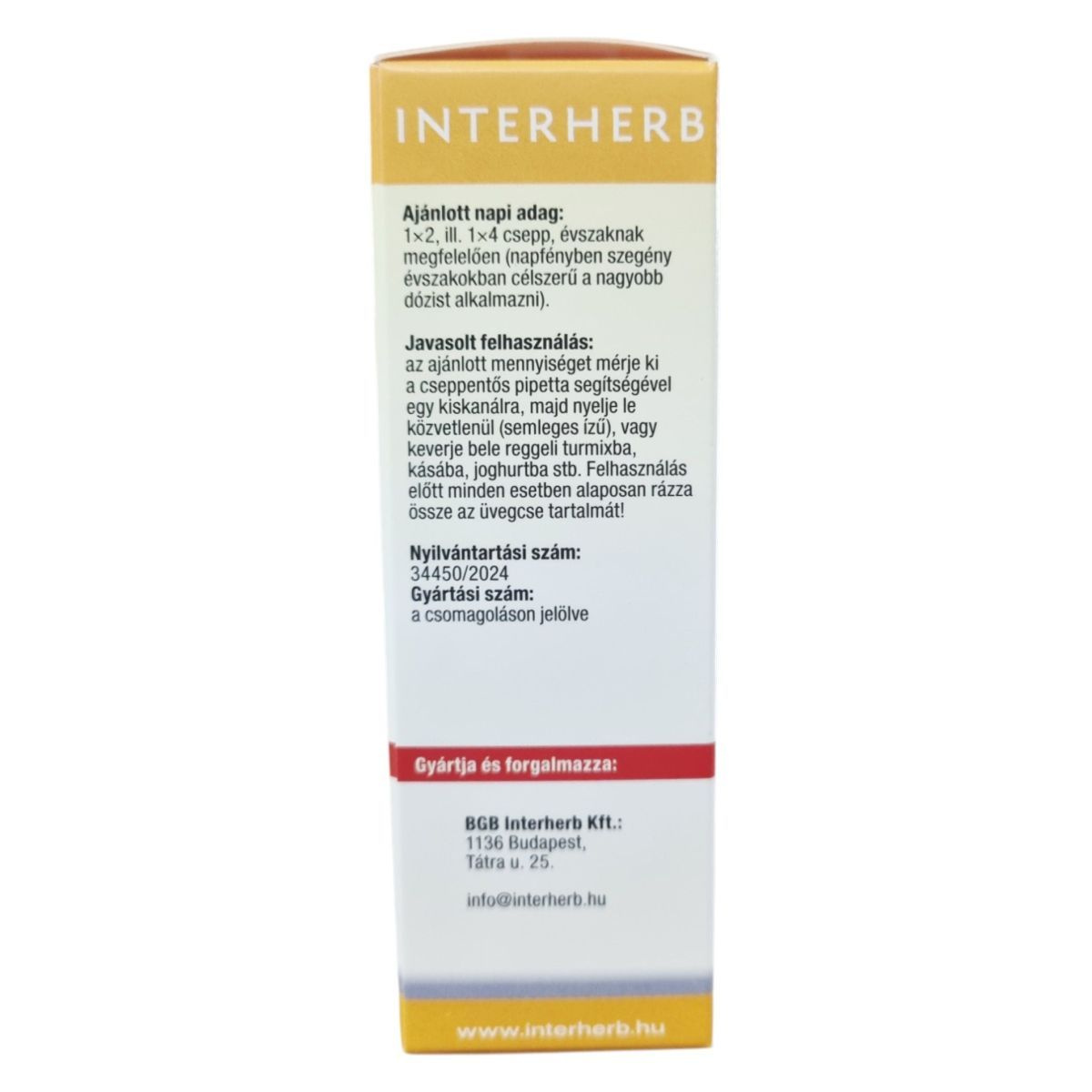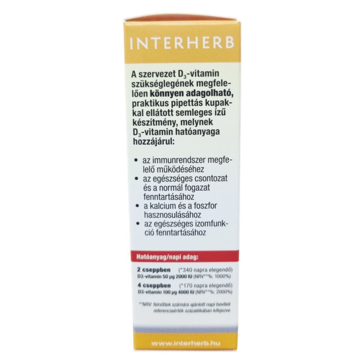 Az INTERHERB D3 Vitamin Forte Csepp egy praktikus pipettás kupakkal ellátott, semleges ízű készítmény, amely akár 340 napra elegendő mennyiséget biztosít. A termék hozzájárulhat az immunrendszer megfelelő működéséhez, az egészséges csontozat és fogazat fenntartásához, valamint a kalcium és foszfor hasznosulásához. A készítmény vegán, és nem tartalmaz színezéket, tartósítószert, aromát vagy édesítőszert. Az ajánlott napi adag 1×2 vagy 1×4 csepp, évszaktól függően. A termék használata előtt alaposan rázza fel az üveg tartalmát, és a cseppeket közvetlenül nyelje le, vagy keverje bele reggeli turmixba, kásába, joghurtba.