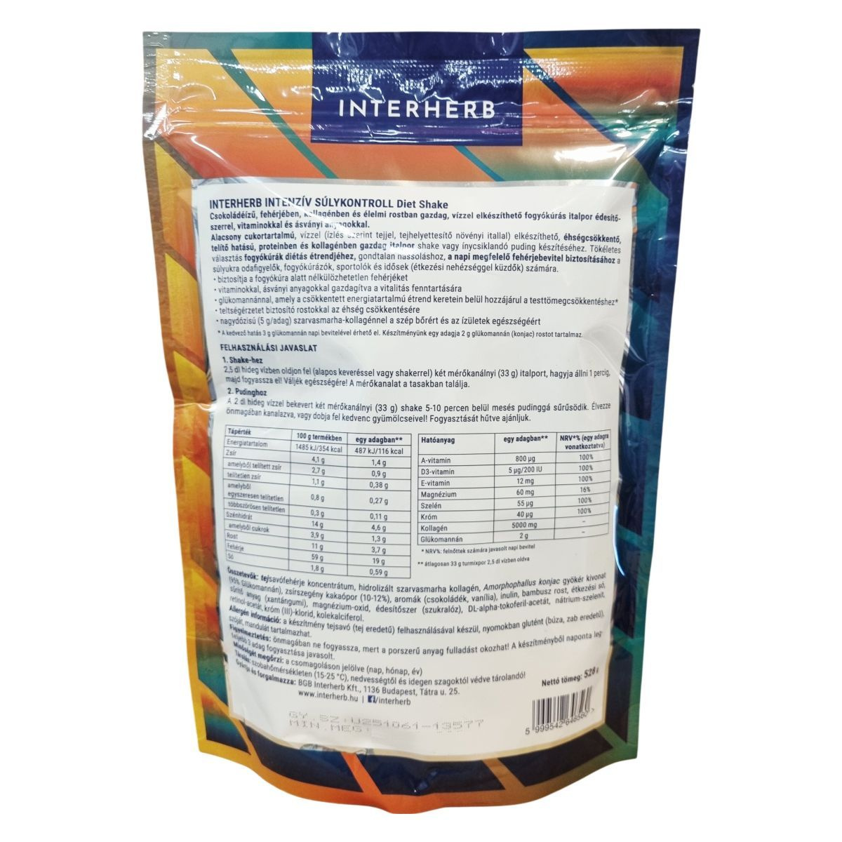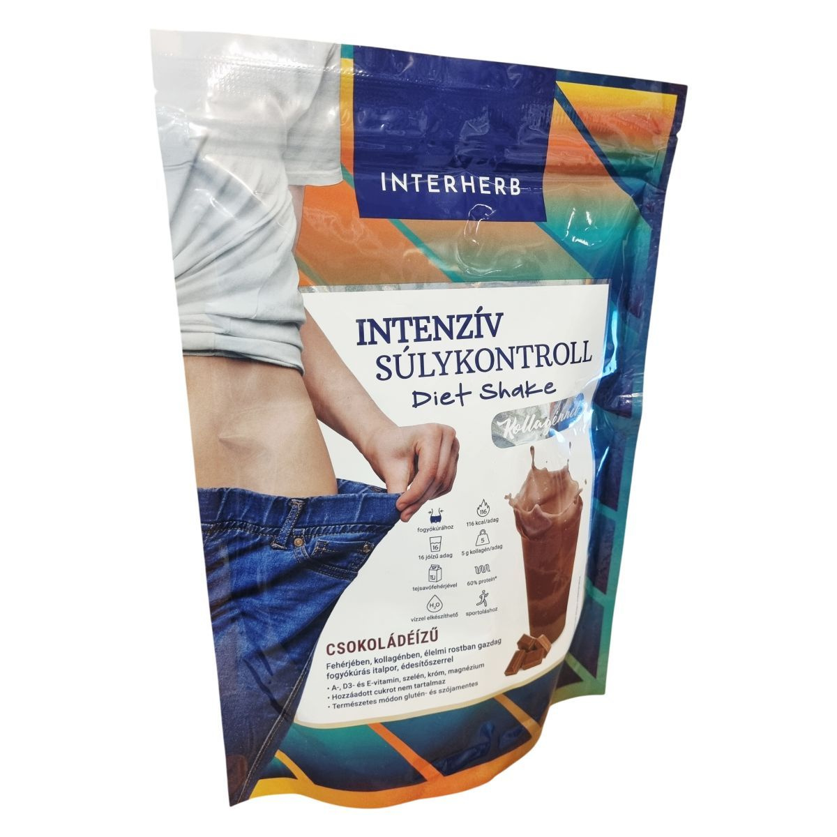 Az Interherb Intenzív Súlykontroll Diet Shake csokoládéízesítésű fogyókúrás italpor, amely alacsony cukortartalmú, vízzel vagy tejhelyettesítő növényi itallal elkészíthető shake vagy puding formájában fogyasztható. A termék fogyókúrák, diétás étrendek mellé ajánlott, mivel a benne lévő glükomannán hozzájárulhat a testtömeg csökkentéséhez, rosttartalma teltségérzetet biztosíthat, fehérjetartalma pedig a diéta során szükséges fehérjebevitelt segítheti. A nagydózisú szarvasmarha-kollagén jelenléte a bőr szépségének és az ízületek egészségének megőrzését támogathatja. A termék alkalmas sportolók, idősek és fogyókúrázók részére, illetve azoknak, akik étkezési nehézségekkel küzdenek. Nem tartalmaz hozzáadott cukrot, természetes módon glutén- és szójamentes, valamint vitaminokkal (A-, D3-, E-vitamin), szelénnel, krómmal és magnéziummal dúsított.