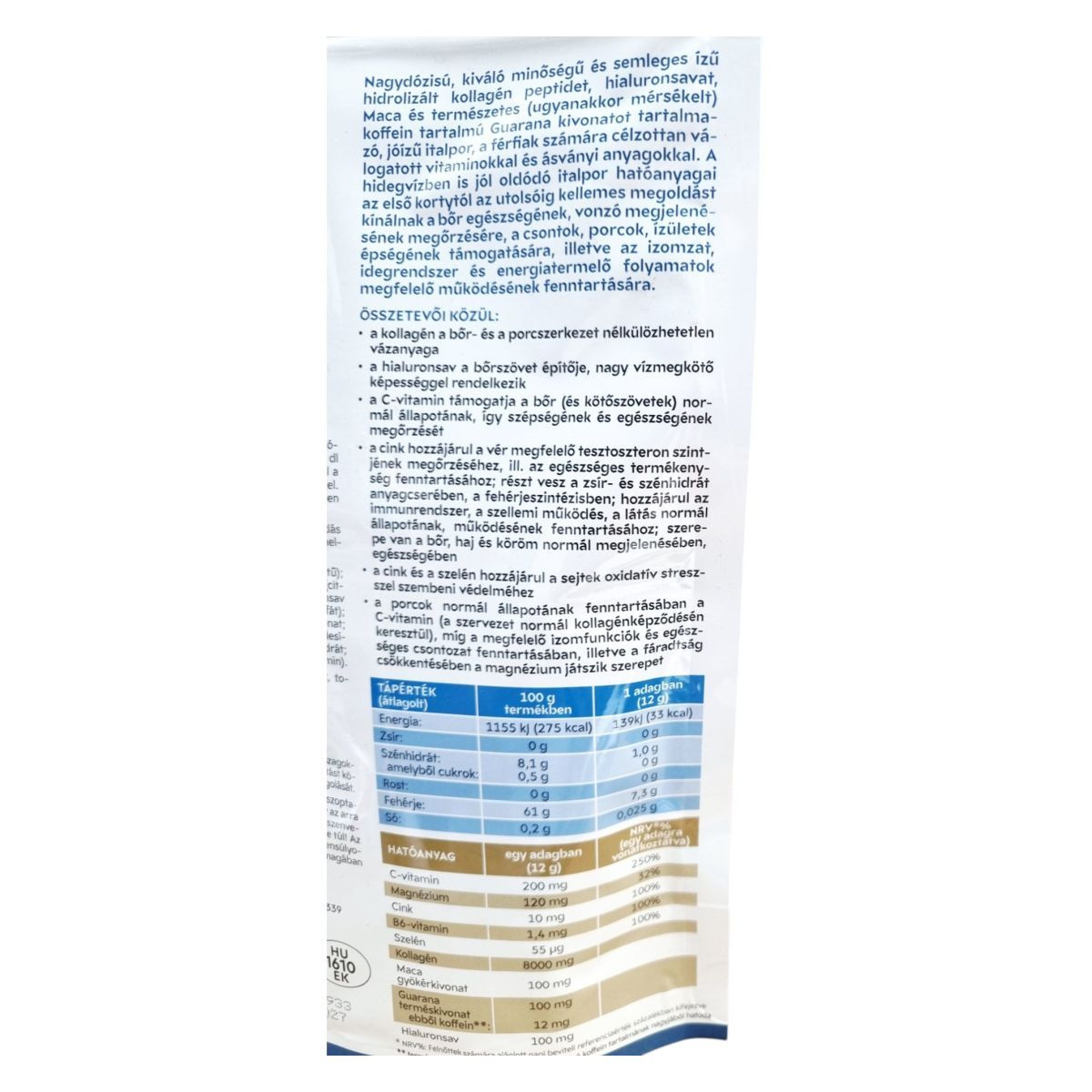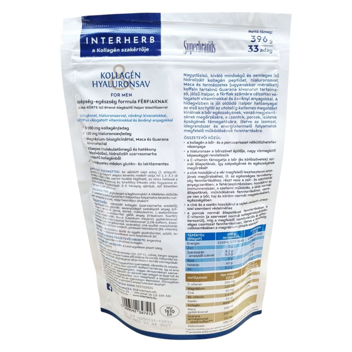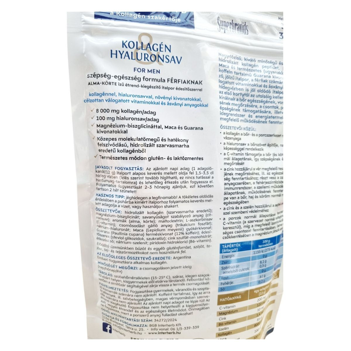 Az INTERHERB KOLLAGÉN & HYALURONSAV FOR MEN egy alma-körte ízű étrend-kiegészítő italpor, amelyet kifejezetten férfiak számára fejlesztettek ki. A termék 8 000 mg kollagént és 100 mg hyaluronsavat tartalmaz adagonként, valamint magnézium-biszglicinátot, Maca és Guarana kivonatokat. A kollagén és hyaluronsav hozzájárulhat a bőr, haj és köröm egészségéhez, míg a magnézium és cink támogathatja az izomműködést és a csontok egészségét. A termék cukor- és tartósítószer-mentes, és természetes módon glutén- és laktózmentes. Az italpor hideg vízben is jól oldódik, és jéghidegen a legfinomabb. Az ajánlott fogyasztási mód szerint 1 adagolókanál italport 1,5-3,5 dl hideg vízben kell feloldani, és étkezés után fogyasztani.