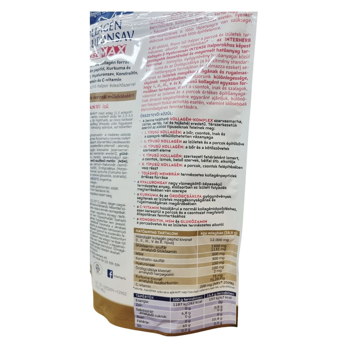 Az idő előrehaladtával ízületeink rugalmassága és terhelhetősége csökkenhet, illetve fokozott fizikai aktivitás vagy sport esetén szervezetünknek több tápanyagra lehet szüksége. Az INTERHERB Kollagén & Hyaluronsav INTENSE MAX italpor jól oldódó, kellemes ízű, narancs-koktél aromájú készítmény, amely emelt dózisban biztosítja a porcok és ízületek természetes alkotóit, beleértve ötféle kollagént (I., II., III., V. és X. típus), továbbá kurkuma- és ördögcsáklya kivonatot, melyek segíthetik az ízületek mozgékonyságának és rugalmasságának megőrzését. A tojás héj membrán természetes kollagénpeptidek értékes forrása, míg a hyaluronsav a vízmegkötő képessége révén hozzájárulhat az ízületi folyadék megtartásához. A C-vitamin támogatja a normál kollagénképződést és ezzel a porcok, csontrendszer megfelelő állapotát, míg a kondroitin, MSM és glükózamin a porcszövetek és ízületek természetes alkotóiként funkcionálnak. A termék természetes módon glutén- és laktózmentes, valamint cukor-, színezék- és tartósítószer-mentes. Többek között ezért ajánlott különösen idősebbeknek és fokozott fizikai aktivitást végzőknek az ízületek és porcok étrend-kiegészítésére.