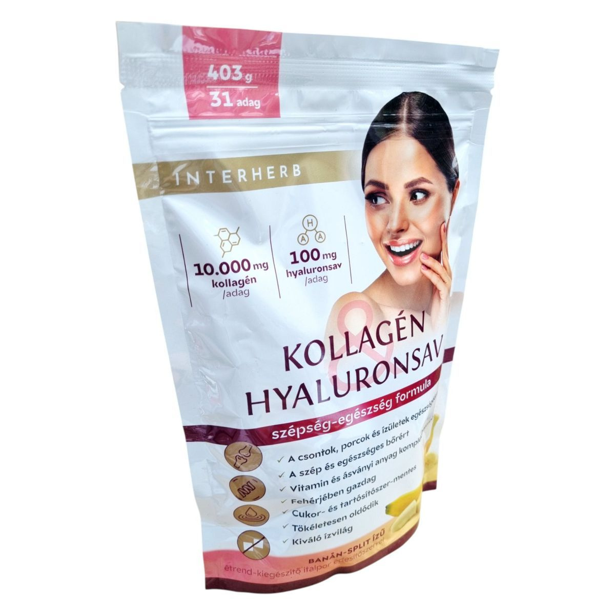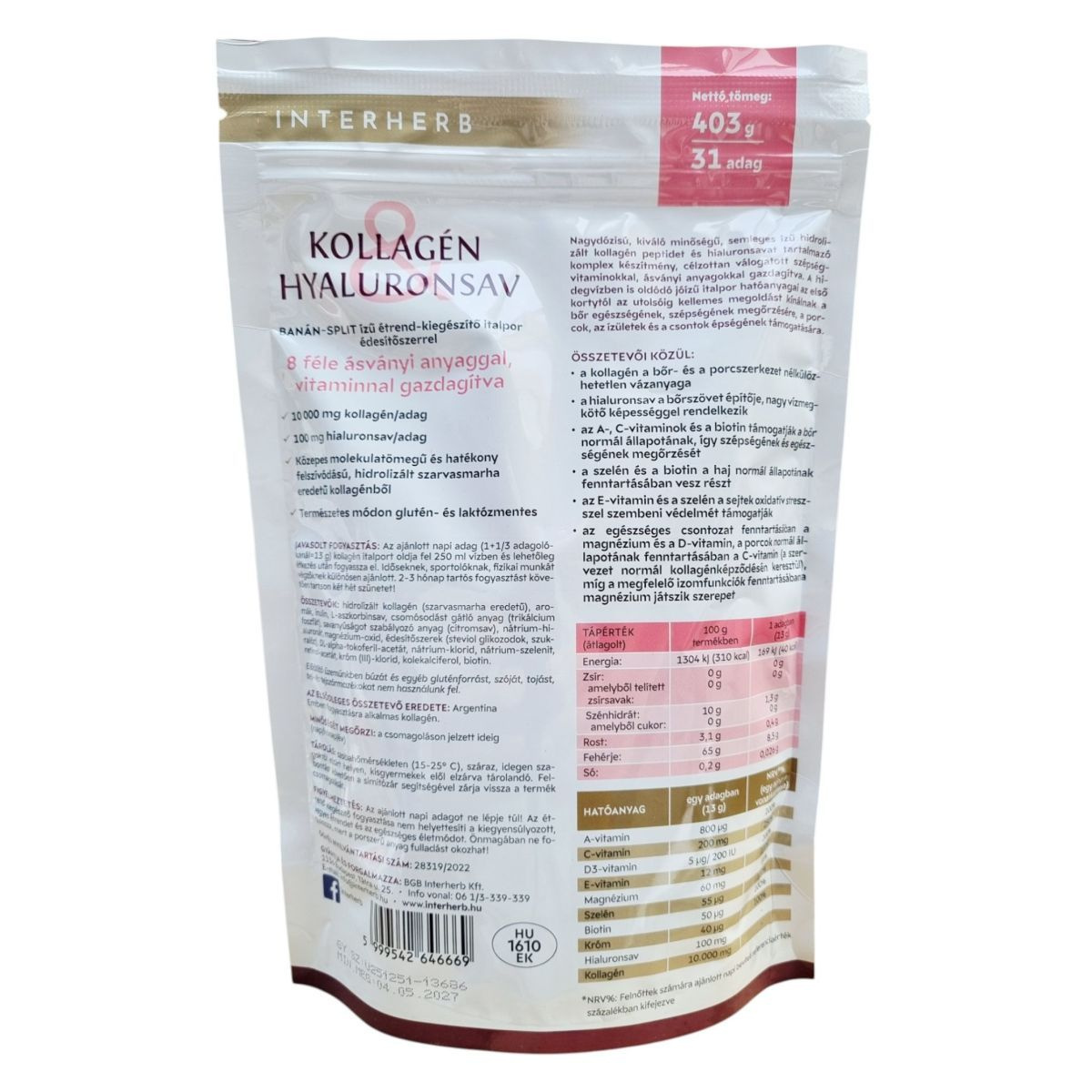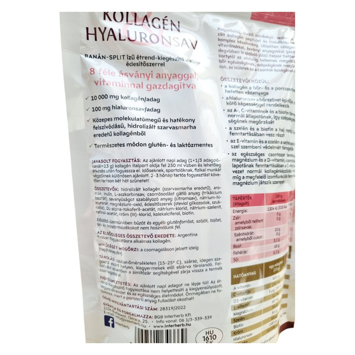 Az INTERHERB KOLLAGÉN & HYALURONSAV italpor egy komplex étrend-kiegészítő, amely nagy dózisú kollagént és hyaluronsavat tartalmaz, hozzájárulva a bőr, a porcok és az ízületek egészségéhez. A termék 8 féle ásványi anyaggal és vitaminnal gazdagított, így támogatva a szervezet különböző funkcióit. A kollagén a bőr- és porcszerkezet nélkülözhetetlen vázanyaga, míg a hyaluronsav a bőrszövet építője, nagy vízmegkötő képességgel. Az A-, C-vitamin és a biotin hozzájárulhatnak a bőr normál állapotának megőrzéséhez, míg a szelén és a cink a sejtek oxidatív stresszel szembeni védelmét támogathatják. A termék banán-split ízű, cukormentes, és tökéletesen oldódik, így kellemes fogyasztási élményt nyújt.