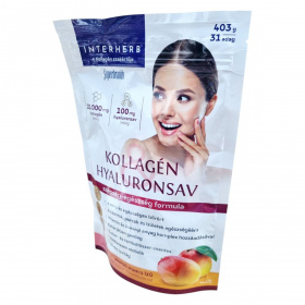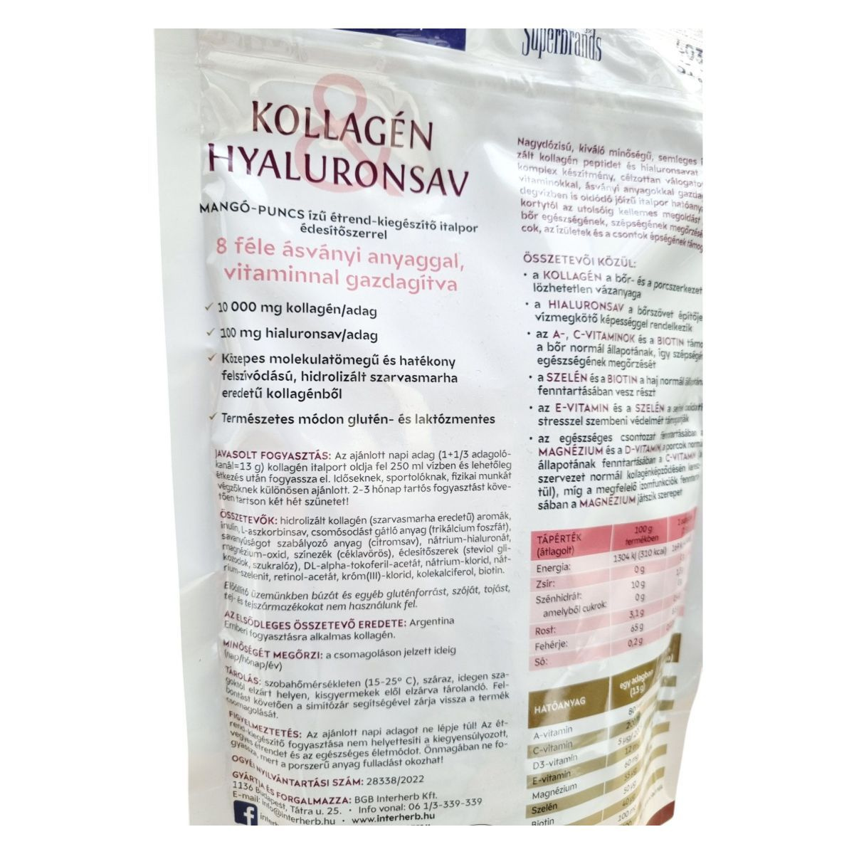 Az INTERHERB KOLLAGÉN & HYALURONSAV mangó-puncs ízű étrend-kiegészítő italpor célzottan válogatott szépségvitaminokkal és ásványi anyagokkal gazdagítva készült. A termék 10 000 mg hidrolizált szarvasmarha eredetű kollagént és 100 mg hyaluronsavat tartalmaz adagonként, amelyek hozzájárulhatnak a bőr, a csontok, porcok és ízületek egészségének támogatásához. A termék cukor- és tartósítószer-mentes, valamint természetes módon glutén- és laktózmentes. A vitaminok, mint az A-, C-, D-, E-vitaminok, valamint a biotin, szelén és króm, hozzájárulhatnak a bőr normál állapotának fenntartásához, a sejtek oxidatív stresszel szembeni védelméhez és az egészséges csontozat fenntartásához. Az italpor könnyen oldódik hideg vízben is, és kellemes ízvilágot kínál.