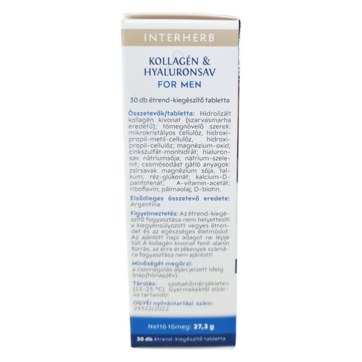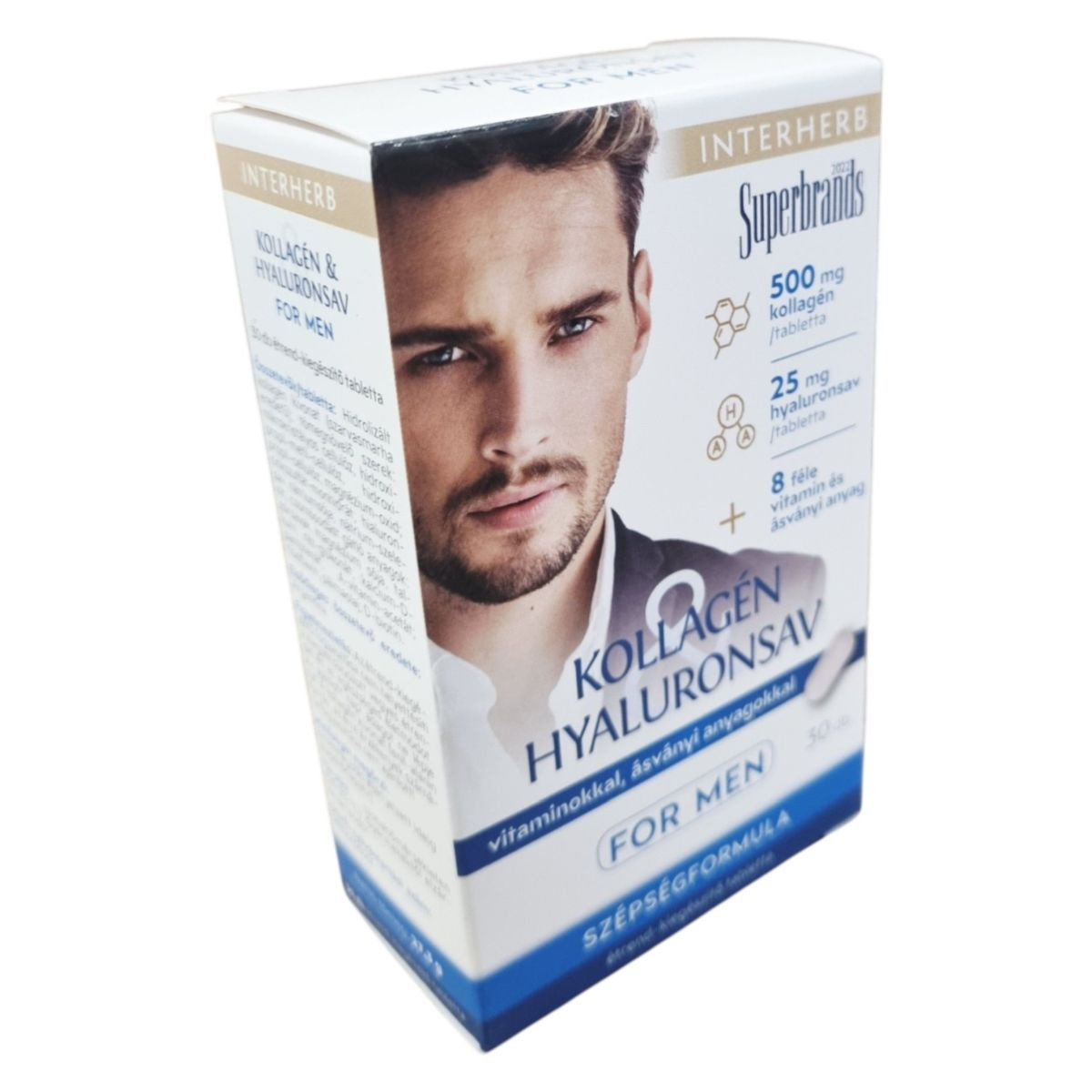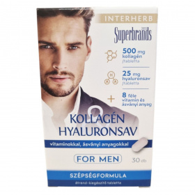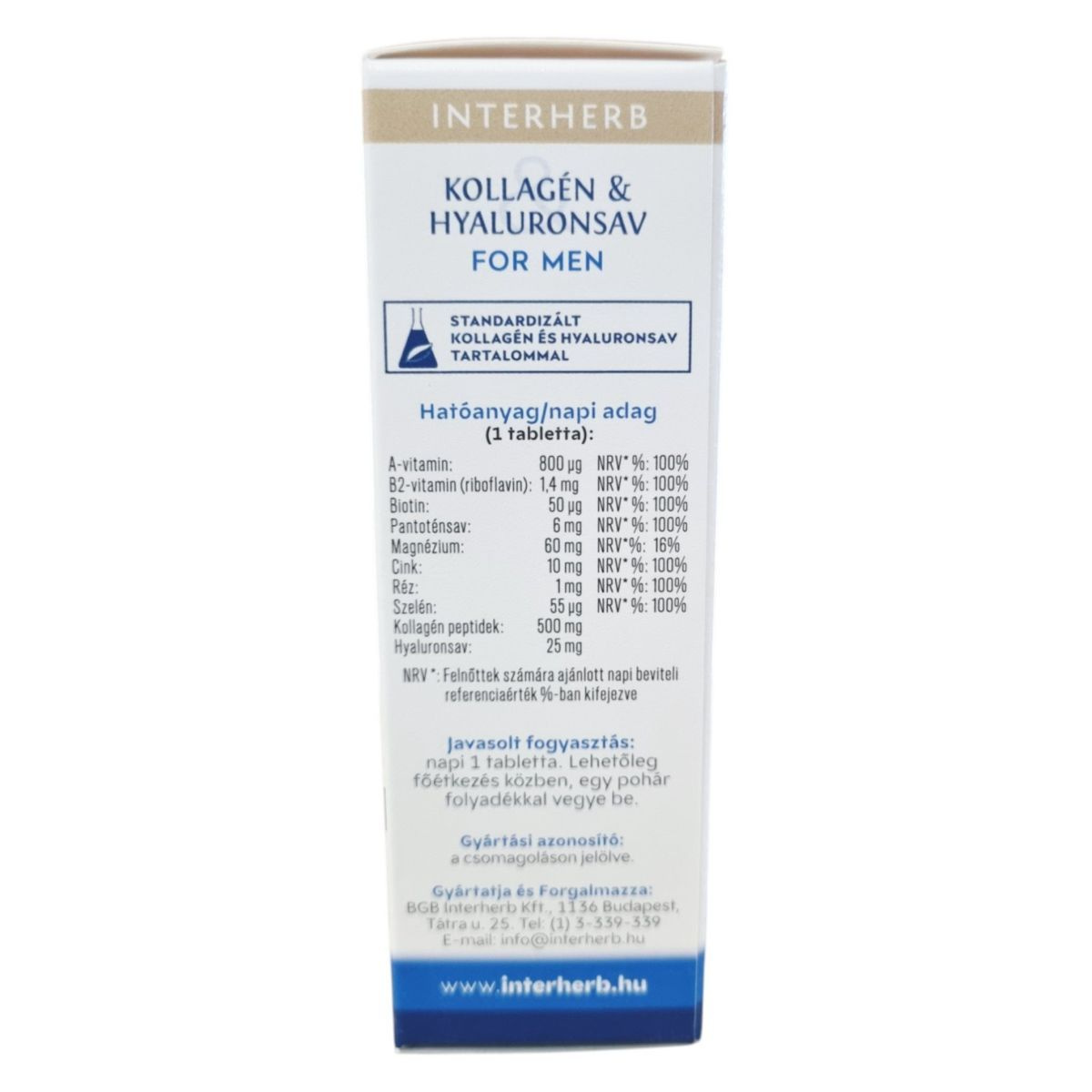 Az INTERHERB KOLLAGÉN & HYALURONSAV FOR MEN étrend-kiegészítő tabletta igényes férfiak számára készült, akik a bőrük, hajuk és körmük egészségének megőrzésére törekednek. A termék kollagén és hyaluronsav tartalmával, valamint vitaminokkal és ásványi anyagokkal segíthet a bőr normál állapotának fenntartásában, a haj és köröm egészségének támogatásában, valamint a vitalitás fenntartásában. A cink, szelén, biotin, A- és B2-vitaminok hozzájárulhatnak a bőr normál állapotának fenntartásához, míg a magnézium és a pantoténsav a fáradtság csökkentésében játszhat szerepet.