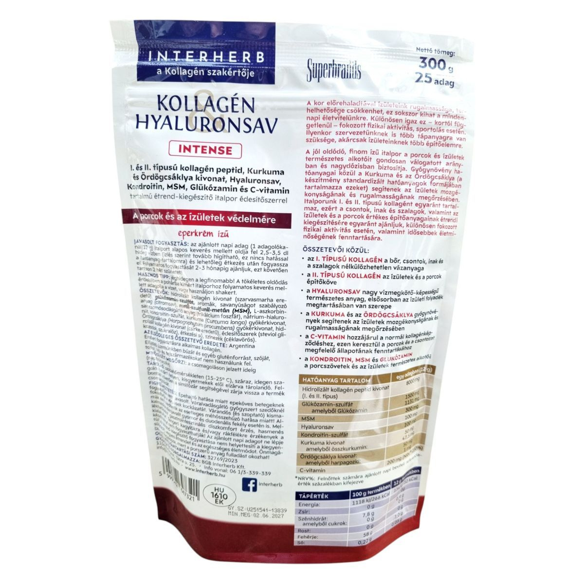 A termék I. és II. típusú kollagén peptideket, hyaluronsavat, valamint kurkuma és ördögcsáklya kivonatot tartalmazhat, amelyek hozzájárulhatnak a porcok és ízületek védelméhez. C-vitamin tartalma támogathatja a normál kollagénképződést.