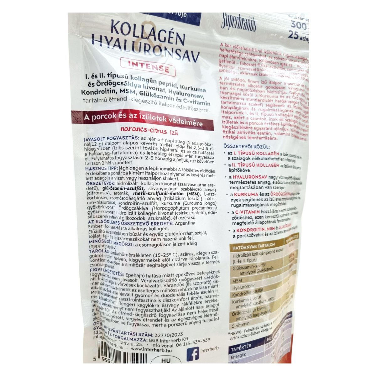 Az INTERHERB KOLLAGÉN & HYALURONSAV INTENSE italpor egy speciálisan összeállított étrend-kiegészítő, amely I. és II. típusú kollagén peptideket, hyaluronsavat, kurkuma és ördögcsáklya kivonatot, valamint C-vitamint tartalmaz. Ezek az összetevők hozzájárulhatnak az ízületek és porcok védelméhez, különösen a kor előrehaladtával vagy fokozott fizikai aktivitás esetén. Az italpor narancs-citrus ízű, cukor- és tartósítószer-mentes, és természetes módon glutén- és laktózmentes. Az ajánlott napi adag 12 g, amelyet hideg vízben kell feloldani és étkezés után fogyasztani. A termék folyamatos fogyasztását 2-3 hónapig ajánlják, majd 2-3 hónap szünet javasolt.